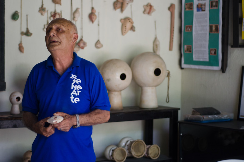 Mestre Nado em seu ateliê, no bairro de Caixa D’Água: produz e repassa a arte das esculturas musicais no barro