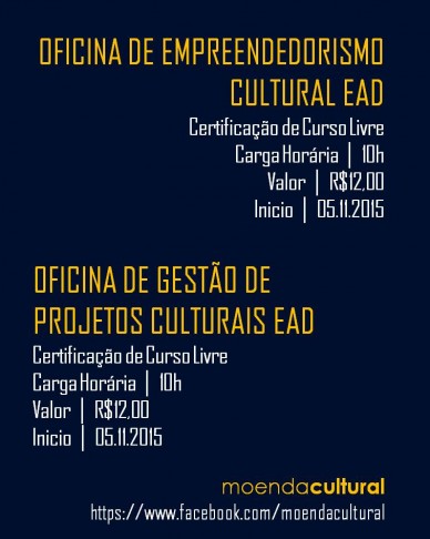 No mês de novembro, a produtora Moenda Cultural estará realizando as oficinas ‘Empreendedorismo Cultural’ e ‘Gestão de Projetos Culturais’. Os cursos, que possuem vagas limitadas para o cadastro de inscrição, contam com a duração de 30 dias, a partir do próximo 5 de novembro. A disponibilidade de horário para a realização de uma das opções oferecidas, fica a critério do participante.