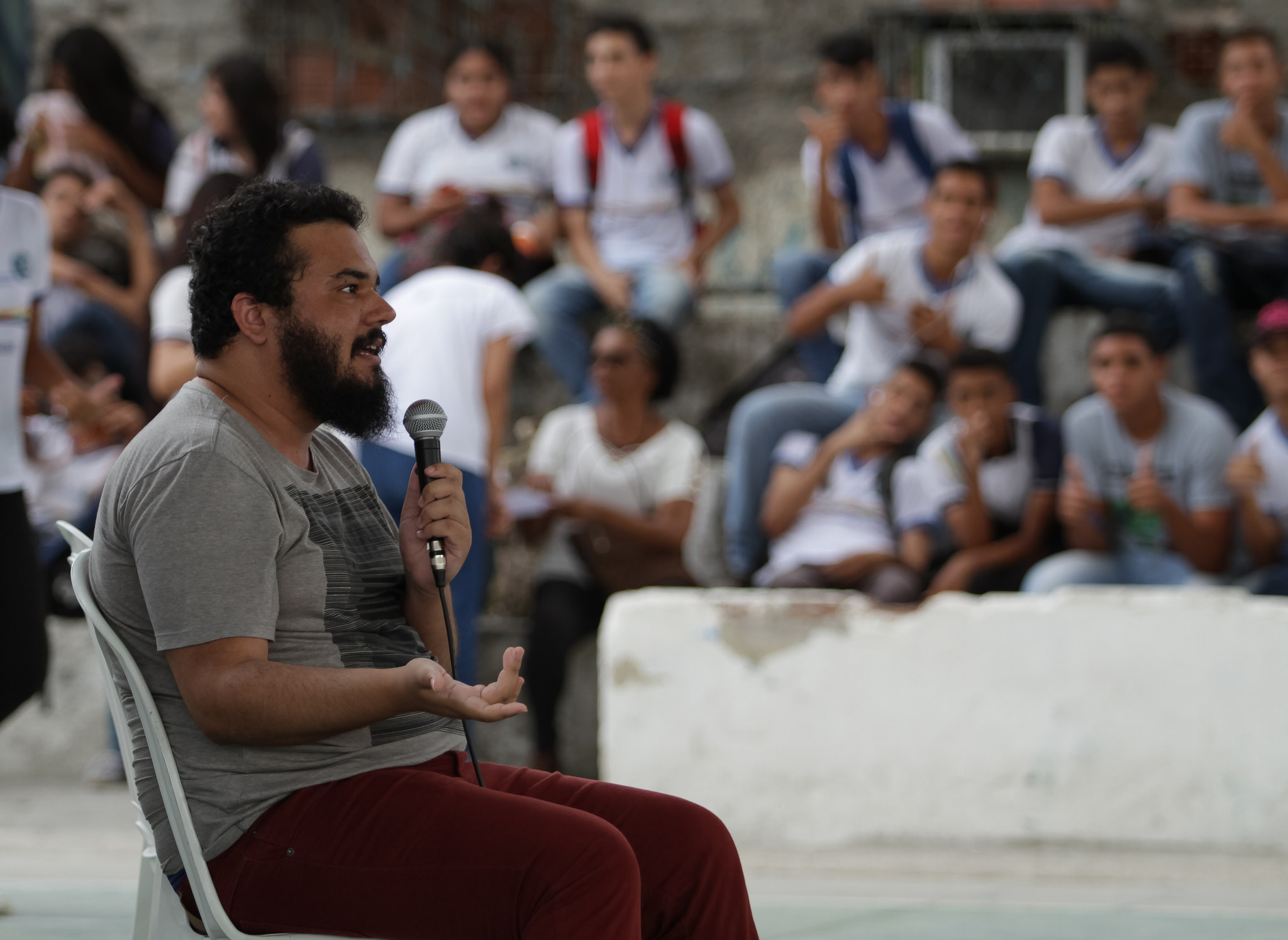 “O papo aqui não vai ser careta não, Camillo José é mais antenado do que muita gente mais jovem que ele. E olhe que ele só tem 24 anos. Vocês vão poder trocar ideias com um cara que tá nas ruas e na internet como vocês. Um papo que todo mundo participa. E se fosse careta eu nem estava aqui, porque eu detesto essas coisas, mas a gente vem pra escola porque isso aqui é muito sério e importante”, disse o produtor.