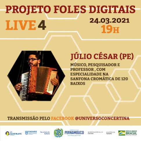 O projeto “Foles Digitais: pesquisa e desenvolvimento de uma concertina regional” segue o mês de março promovendo intercâmbio cultural através de encontros virtuais com músicos de fole de várias regiões do país. O projeto iniciou uma rodada de conversas, por meio de Lives, com a participação do luthier de bandoneons Daniel Quandt (SC) e do mestre da concertina, Angelino Zaager (ES), e continua falando de fole durante esta semana: na quarta (24) é a vez do músico, pesquisador e professor, Júlio César (PE) e, na sexta, do multi-instrumentista, compositor e pesquisador, Leo Rugero (RJ).