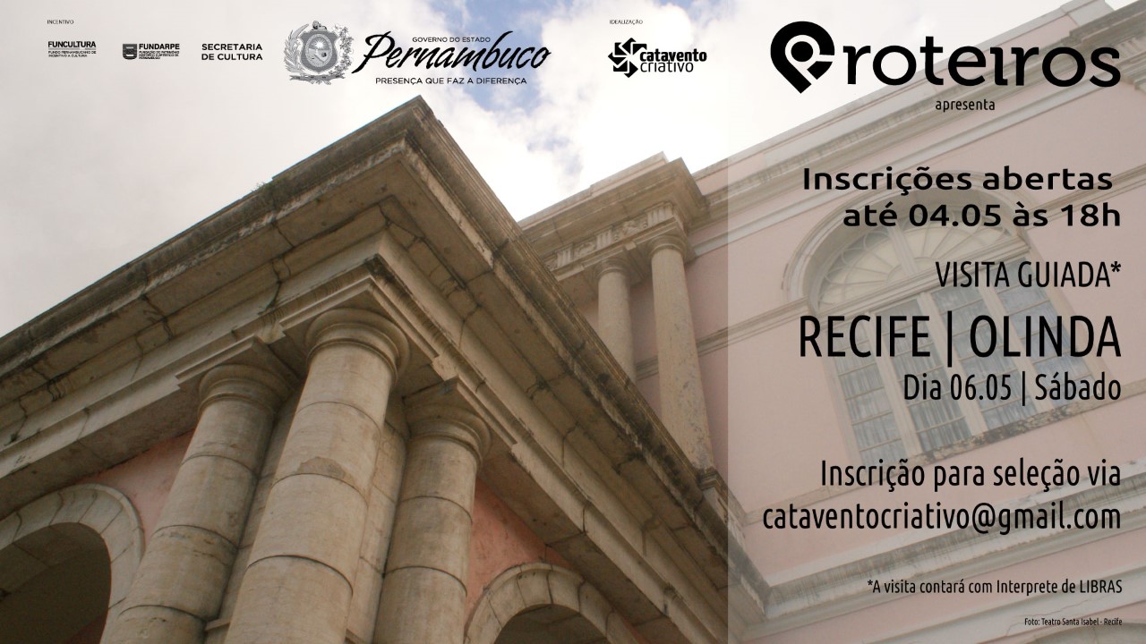 O projeto cultural Roteiros PE está com inscrições abertas para novos passeios pelo patrimônio cultural do estado. Neste sábado e domingo, 6 e 7 de maio, os roteiros vão contemplar equipamentos culturais de Recife, Olinda, Igarassu, Itamaracá e Goiana. As vagas são limitadas e as inscrições podem ser feitas através do e-mail cataventocriativo@gmail.com. Roteiros PE é mais uma ação cultural que conta com o incentivo do Governo de Pernambuco, por meio do Funcultura.