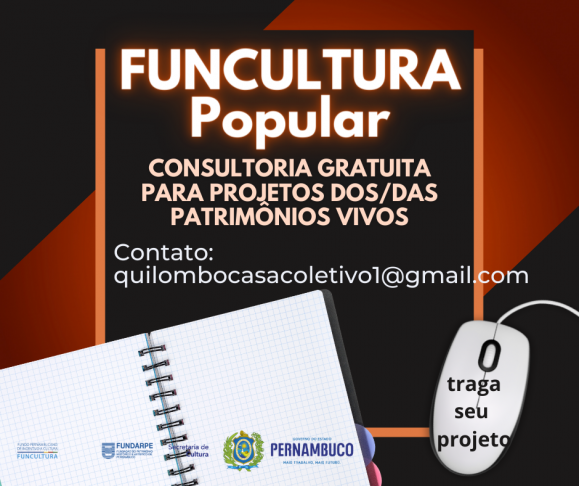 O Quilombo Cultural Casa Coletivo, comandado pela coquista, matrigestora e pesquisadora autônoma Una (Elaine Una), vai realizar uma série de consultorias on-line e gratuitas para submissão de projetos na área de formação no Funcultura Geral, que tenham como foco nos Patrimônios Vivos do Estado de Pernambuco, além de outros editais com foco na Preservação e Salvaguarda do Patrimônio Cultural. A consultoria será realizada de forma remota. Para maiores informações: (81) 999719-0556 (WhatsApp) | quilombocasacoletivo1@gmail.com.