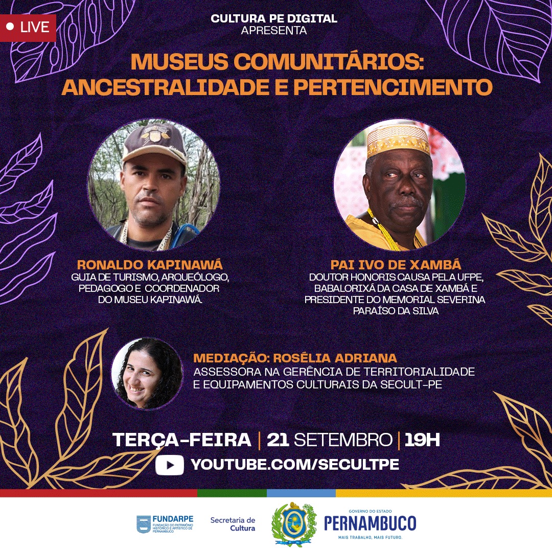 A Secretaria de Cultura de Pernambuco (Secult-PE) realiza, na próxima terça-feira (21), a partir das 19h, a live “Museus comunitários: ancestralidade e pertencimento”, que vai ao ar no canal que a Secult-PE mantém no Youtube (www.youtube.com/SecultPE). O programa faz parte da 15ª Primavera dos Museus, evento organizado pelo Instituto Brasileiro de Museus (Ibram), que acontece de 20 a 26 de setembro, reunindo mais de 680 instituições de todo o país.
