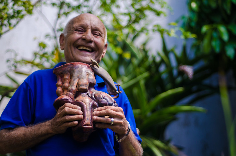 Aguinaldo da Silva, o Mestre Nado, tem no seu currículo inúmeros projetos de destaque e sucesso, tendo assinado trabalhos com grandes referências da cultura pernambucana, como Francisco Brennand, e também intervenção em espaço urbano com a icônica obra no Museu do Trem, o conhecido painel de locomotivas. Já em seu próprio ateliê, experimentando técnicas para inovar sua produção, o artista lembra que aprendeu com o tio a fazer apitos com o caule da folha do jerimum e da folha de coqueiro. Então, resolveu testar o mesmo apito, em uma bola oca de cerâmica, que já vinha produzindo como objeto apenas decorativo. Ele nunca havia tocado nenhum instrumento de sopro: dois furos em uma bola oca. Então, sentiu que tinha descoberto algo especial.