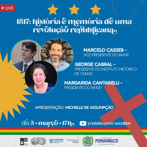 Com as participações de Margarida Cantarelli (presidente do Instituto Arqueológico, Histórico e Geográfico de Pernambuco – IAHGP), Marcos Casseb (vice-presidente do IAHGP) George Cabral (presidente do Instituto Histórico de Olinda), que também mediará o encontro, o bate-papo será exibido nesta sexta-feira (5), às 17h, e destacará a luta do povo pernambucano à frente da Revolução de 1817, movimento deflagrado em nosso Estado que prenunciou a Independência do Brasil (1822).