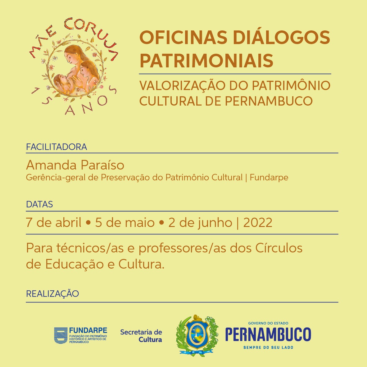 A Secult/Fundarpe-PE promove as oficinas Diálogos Patrimoniais, nos meses de abril, maio e junho, como parte integrante das ações do Projeto Cultura nos Cantos, idealizado em 2017 para o Mãe Coruja Pernambucana. O programa oferece apoio às mães de Pernambuco, antes e depois do parto, com o objetivo de prestar atenção integral às mulheres usuárias do Sistema Único de Saúde (SUS) e aos seus/suas bebês.