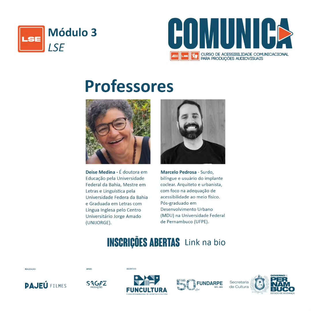 O projeto Comunica: Curso de Acessibilidade Comunicacional para Projetos Audiovisuais é uma produção da Pajeú Filmes, com incentivo do Fundo Pernambucano de Incentivo à Cultura (Funcultura), da Fundação do Patrimônio Histórico e Artístico de Pernambuco (Fundarpe), da Secretaria Estadual de Cultura e do Governo de Pernambuco.