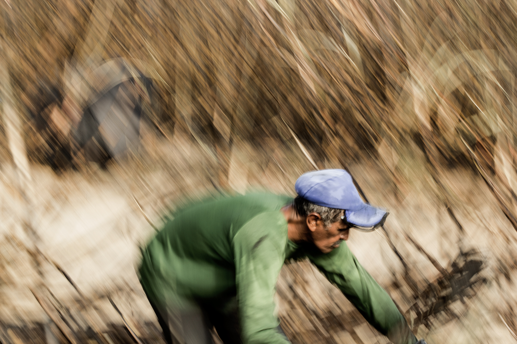 As imagens captadas por Joãomiguel, que optou por expor em P&B, evidenciam de maneira visceral a força da mão de obra dos trabalhadores nos canaviais, bem como as singelezas das vestimentas, o refúgio num gole d’agua mesmo sob o sol fervente e o cansaço no trajeto de volta para casa. Em contraponto ao cinza, Francisco traz as cores relatando com abstrações ou cortes detalhados o labor daqueles homens que se misturam às palhas da cana, à poeira e ao fogo diariamente.