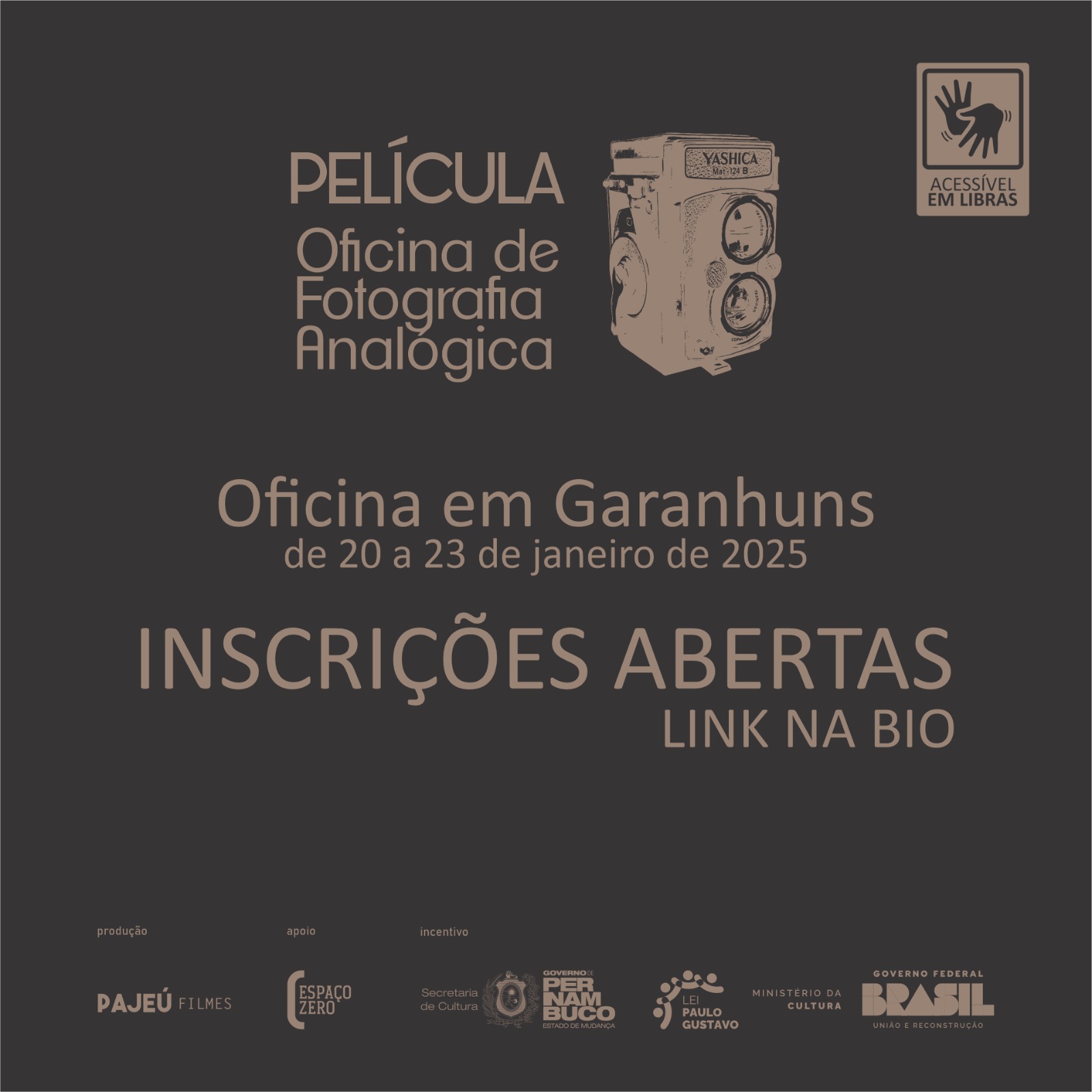Terminam nesta quinta-feira (16) as inscrições do projeto Película: Oficina de Fotografia Analógica, no município de Garanhuns (Garanhuns). A participação é gratuita e pode ser efetivada por formulário on-line. Podem se inscrever pessoas maiores de 16 anos, com disponibilidade para participar das aulas e interesse na realização de fotografias analógicas, residentes em Garanhuns e região. Não há obrigatoriedade de possuir equipamento analógicos ou conhecimento prévio.