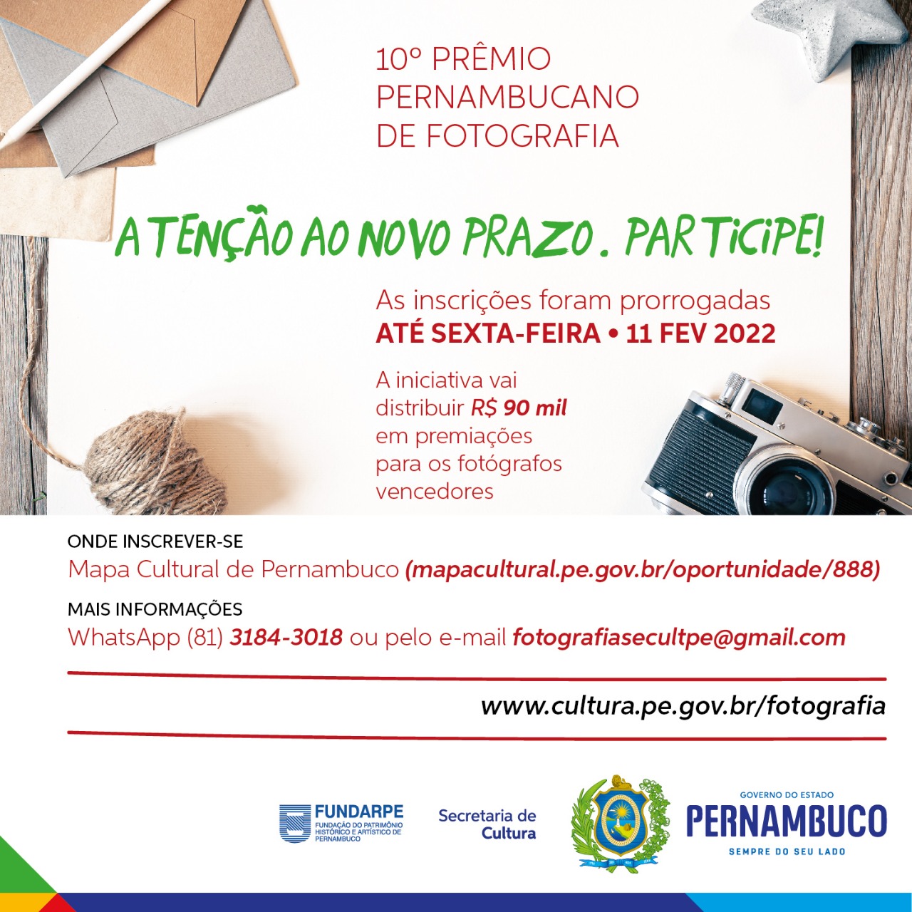 A Secretaria Estadual de Cultura (Secult-PE) decidiu prorrogar o prazo final de inscrições do 10º Prêmio Pernambuco de Fotografia 2021 para até esta sexta-feira (11/02), às 17h59. Cada proponente pode submeter até quatro fotografias (para saber as especificações técnicas, leia o edital na íntegra aqui), porém, só poderá ser premiado por uma única imagem. As inscrições devem ser realizadas exclusivamente pela plataforma do Mapa Cultural de Pernambuco (mapacultural.pe.gov.br/oportunidade/888).