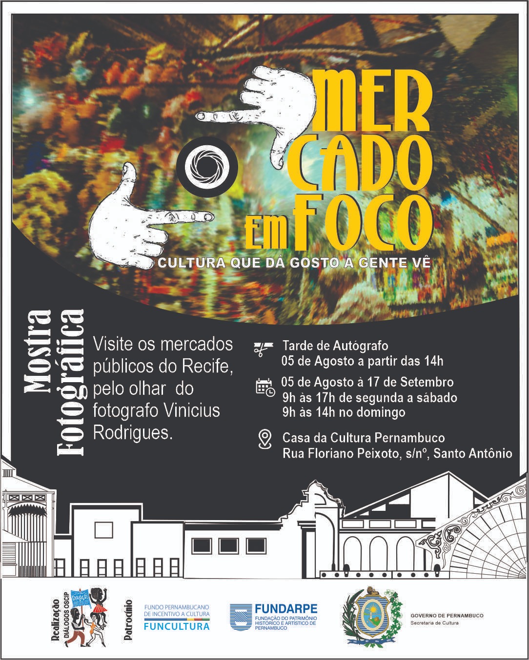 A exposição fotográfica “Mercado em Foco: Cultura Que Dá Gosto a Gente Vê”, entra em cartaz, na Casa da Cultura Luiz Gonzaga, bairro de São José, área central da cidade da capital pernambucana. A mostra reúne um conjunto de fotografias inéditas sobre os cinco mercados públicos do Recife: Mercado de São José, Mercado da Boa Vista, Mercado da Madalena, Mercado da Encruzilhada e Mercado de Afogados.