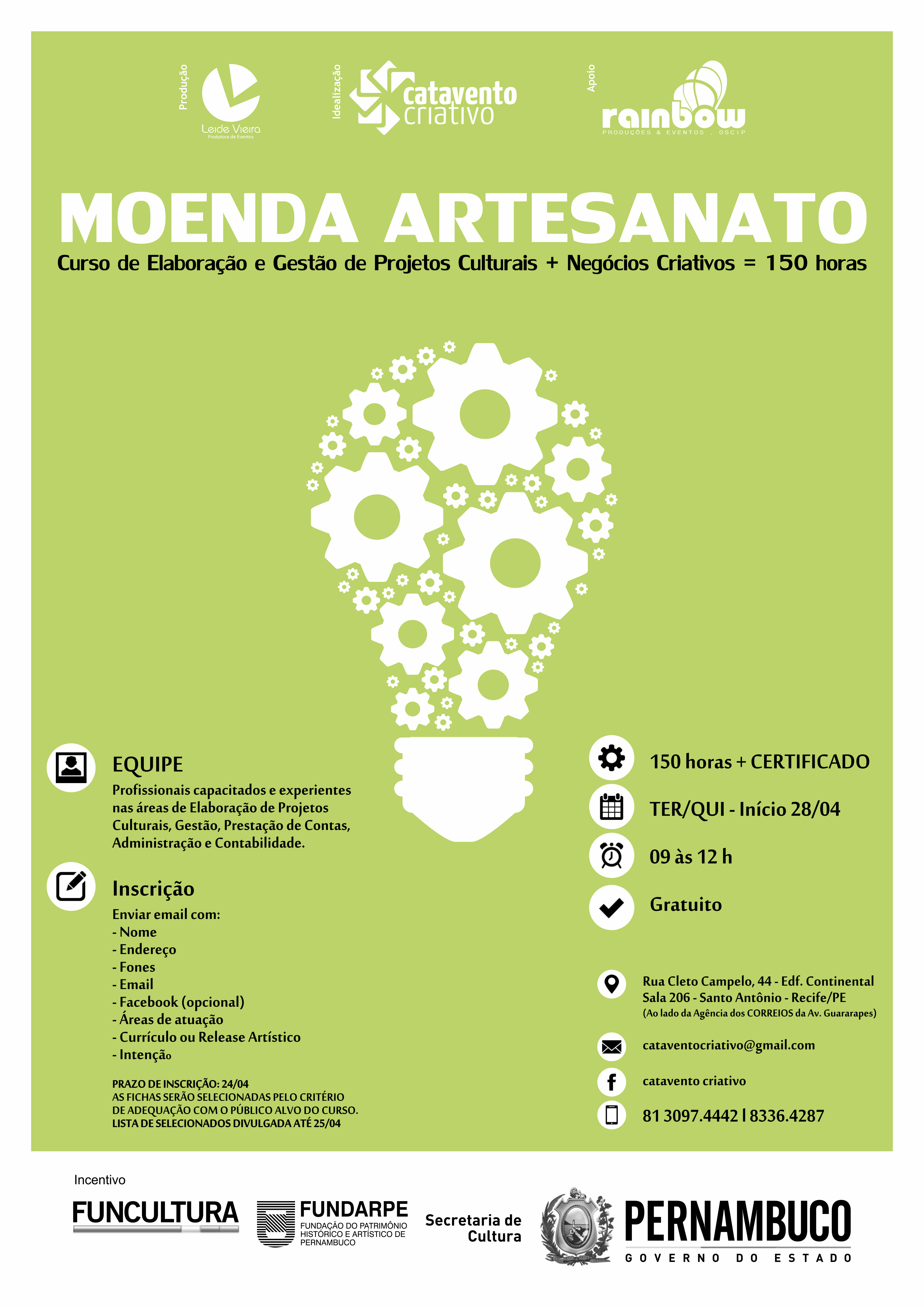A produtora Catavento Criativo está com inscrições abertas, até o dia 24 de abril, para os cursos Moenda – Elaboração de Projetos Culturais e Negócios Criativos, ambos incentivados pelo Funcultura, Governo de Pernambuco. As capacitações são voltadas para as áreas de artesanato e cultura popular e são oferecidas gratuitamente. Os interessados devem se inscrever pelos telefones: (81) 3097-4442 e (81) 8336-4287, ou através do e-mail cataventocriativo@gmail.com.