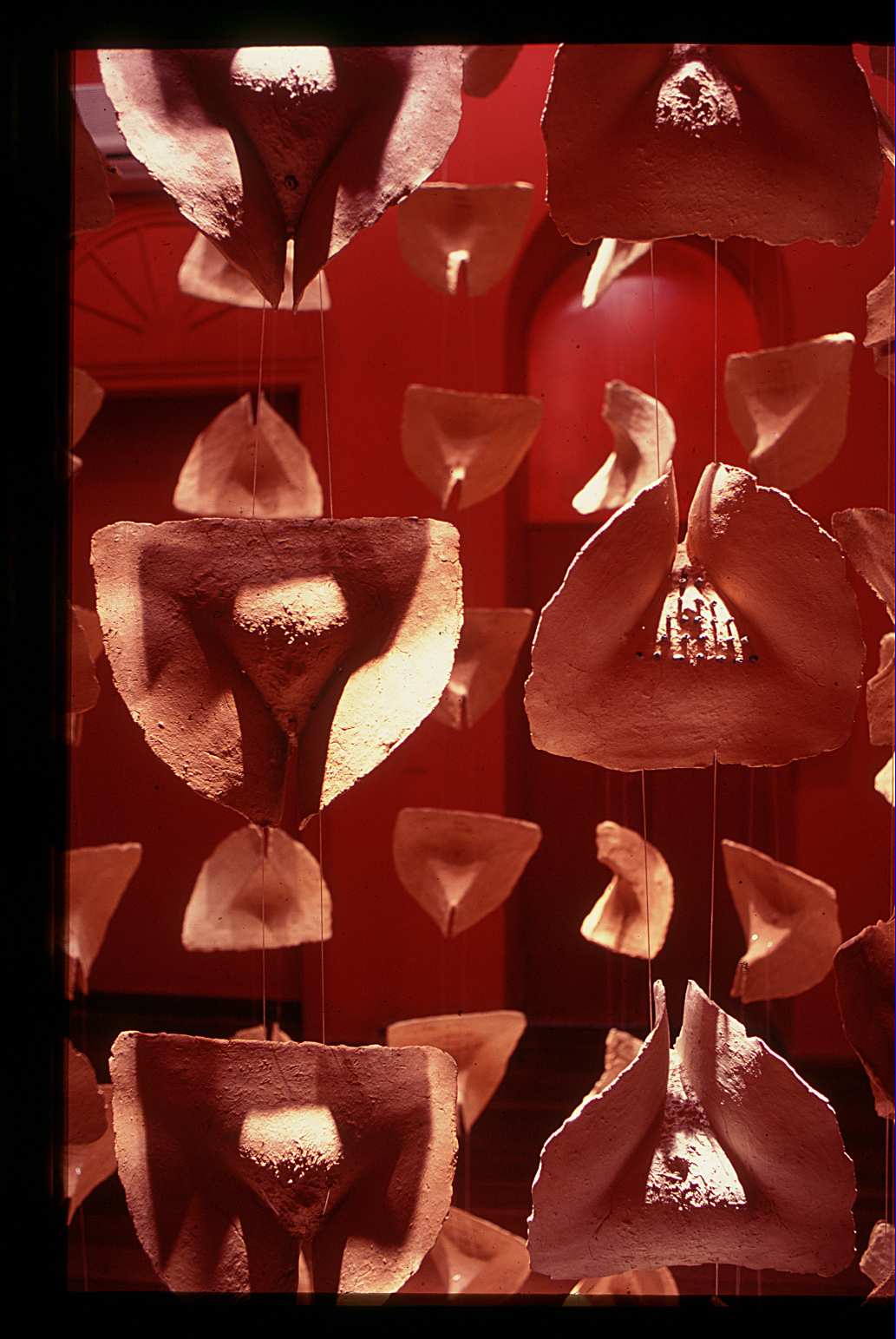 “O Brasil sofre o golpe em 2016, e logo saiu a notícia de uma menina que havia sofrido um estupro coletivo por mais de 30 homens. Isso tudo me fez voltar a pensar nas vaginas, um trabalho antigo que havia iniciado pelos anos 2000”, lembra. Nessa obra das vaginas , Christina tem como matriz de gesso sua pélvis e a molda no barro, criando intervenções das mais diversas maneiras, a partir desse órgão do corpo feminino. As Vaginas são derivações de A pele é o que separa o corpo do mundo, pesquisa que é a base de todo o processo criativo da artista. “A relação entre pele e cerâmica desencadeia a criação da fôrma do corpo-pélvis e consequentemente na revelação da intimidade, tratando-se de um processo em ‘exposição’ do corpo e também da ‘desvelação de um terreno íntimo’”, escreve a artista.