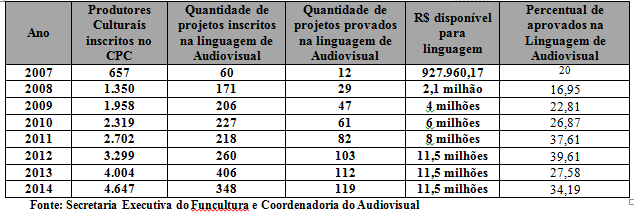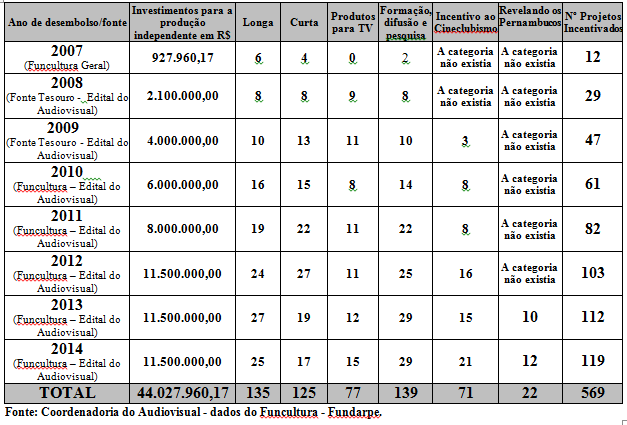Confira no quadro abaixo a evolução dos incentivos aos projetos de produção independente de Audiovisual em Pernambuco (2007 a 2014):