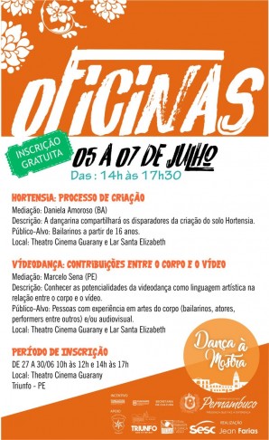As inscrições podem ser feitas no Theatro Cine Guarany até a sexta-feira (30), nos horários das 10h às 12h e das 14h às 17h. As oficinas vão acontecer no Lar Santa Elizabeth, nos dias 5 a 7 de julho. Em Hortensia – Processo de criação, a dançarina Daniela Amoroso compartilhará os disparadores da criação do solo Hortensia. Já o bailarino Marcelo Sena vai ministrar a oficina Vídeodança- contribuições entre o corpo e o vídeo.