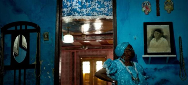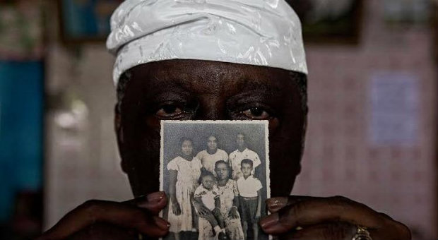 A mostra conta com 12 fotos que ficarão expostas na Casa das Máquinas de 11 a 16 de abril. . Na foto, o babalorixá Ivo segura com as duas mãos uma outra imagem que mostra ele ainda criança no colo de Mãe Biu.