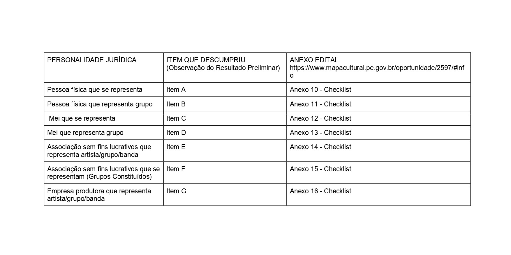 Vale lembrar que a tabela acima se refere ao edital da Convocatória Nacional Pernambuco Meu País. A numeração do anexo é diferente para cada edital.