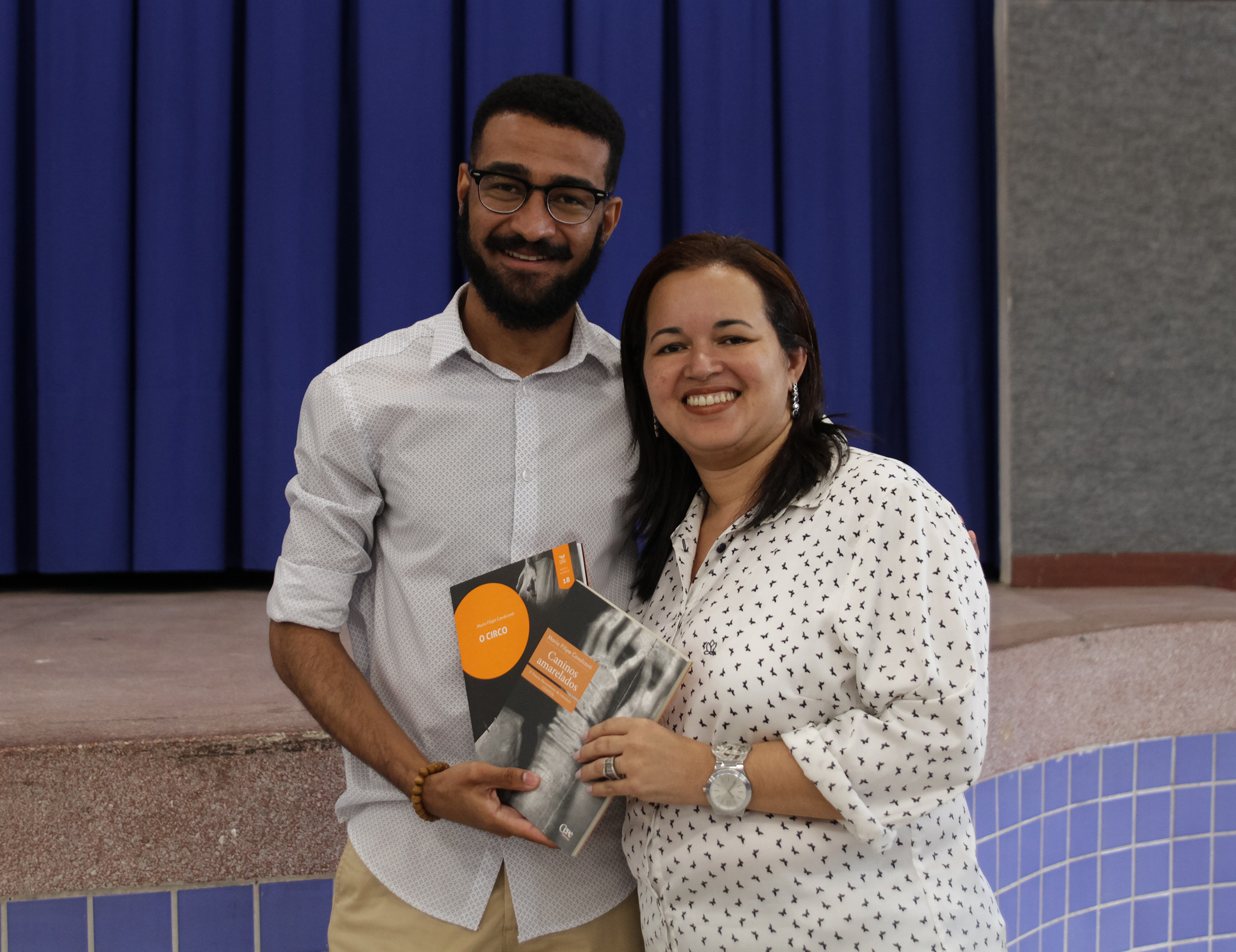 Ex-aluno do EREM Nóbrega, Mário Filipe doou livros para sua antiga escola, representada pela diretora Andrea Vieira.