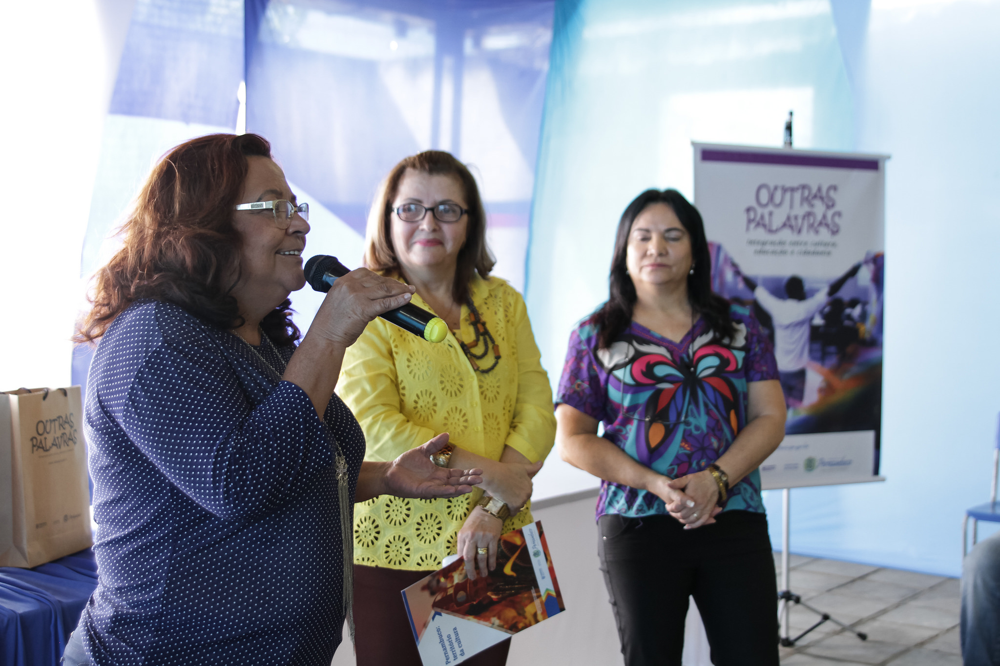 Antonieta Trindade, gestora do Outras Palavras e vice-presidente da Fundarpe, ao lado de Lourdinha Mergulhão (presidente da ABLA) e de Luciene Souza, gestora do EREM Bento Américo