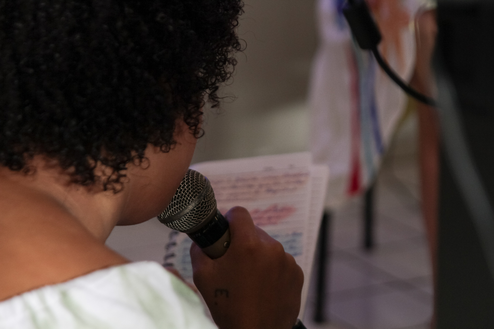 As jovens foram convidadas a ler e recitar no microfone