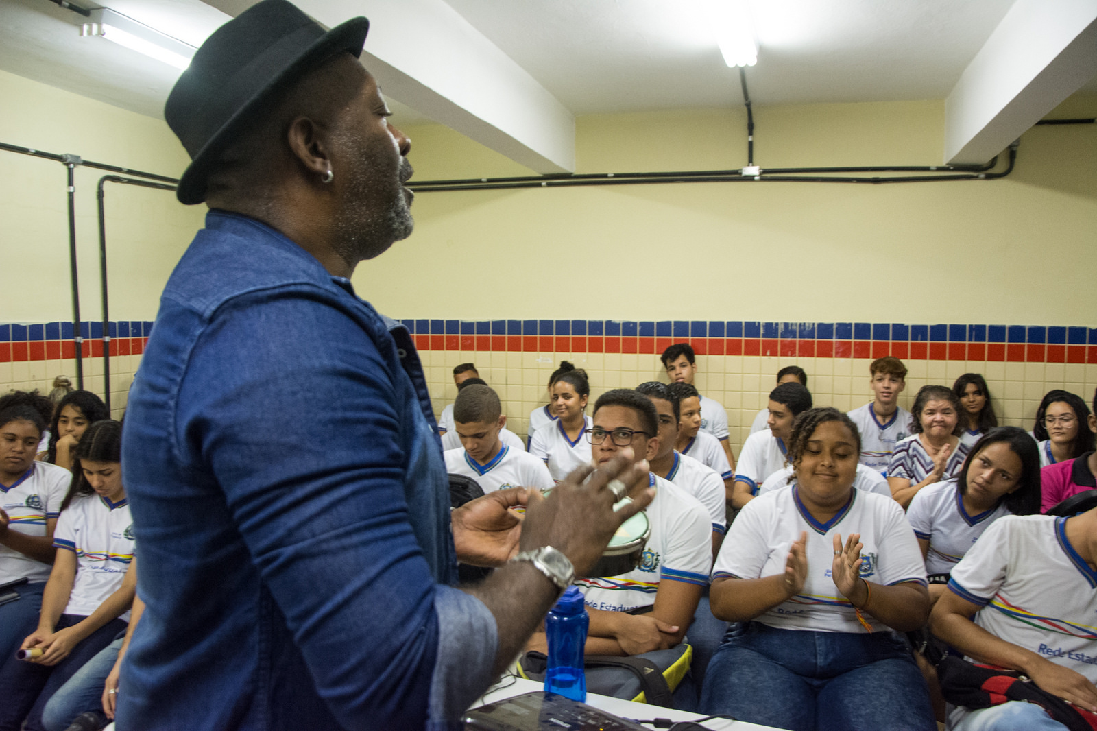 Jorge Riba, ao assumir a fala, não deixou nem a peteca nem o pandeiro caírem e prendeu a atenção da garotada com maestria. “Me criei no Morro da Conceição e no bairro de Rio Doce. No Morro, tem muito samba e candomblé. Dentro desse universo que fui me moldando, pelo viés da religiosidade e da arte. Minha avó me levava para os terreiros e eu ouvia a música sendo tocada também por grandes sambistas do meu bairro”.