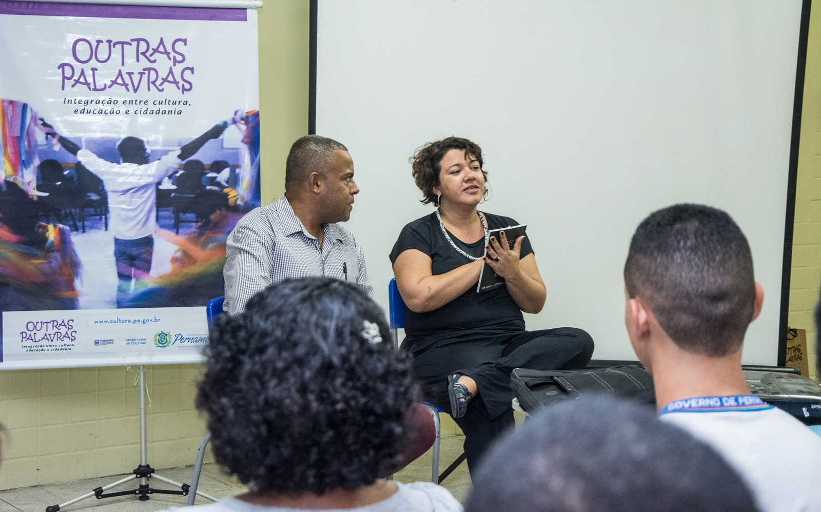 A última edição do Outras Palavras deste ano, na última quarta-feira (5), foi impecável dentro do que o projeto se propõe: uma verdadeira aula sobre cultura e arte dentro do ambiente escolar, com intensa participação dos jovens. Não foram poucas as vezes que os estudantes da EREM Capitão Luiz Reis, no Alto da Bondade, em Olinda, levantaram as mãos pra tirar suas dúvidas com os dois convidados: a escritora Ezter Liu e o sambista Jorge Riba. Ambos assumiram, de uma forma bem humorada e divertida, os papéis de professores e falaram, respectivamente, sobre os processos criativos e artísticos dentro da literatura e do samba pernambucano.