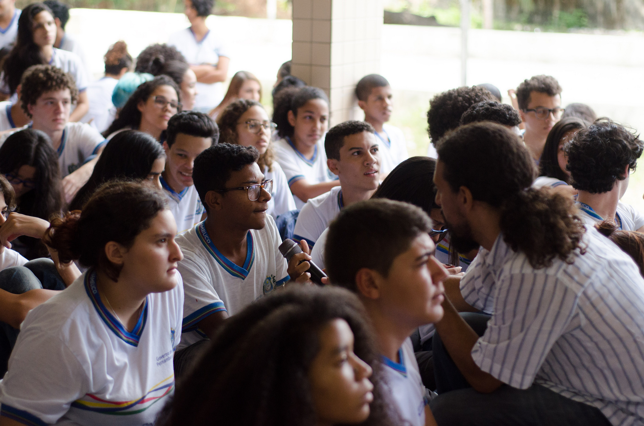Já o percussionista Gilú Amaral usou a música para falar sobre a cultura como um traço de identidade de um povo. “É muito importante conhecer a música do nosso Estado para saber quem somos nós e de onde a gente vem. Se você tirar a cultura de uma pessoa, você tirou tudo dela, por isso é importante a gente estar antenado ao que é nosso”, defendeu ele, depois de tocar um Coco para os alunos e ensinar a diferença entre Maracatu de Baque Solto e de Baque Virado e suas origens africanas e indígenas. Entre uma música e outro, Gilú foi bastante didático ao apresentar para os alunos os instrumentos que usava, como o hanging drum, o caxixi, o talking drum e o pandeiro, sempre diante do olhar curioso dos adolescentes.