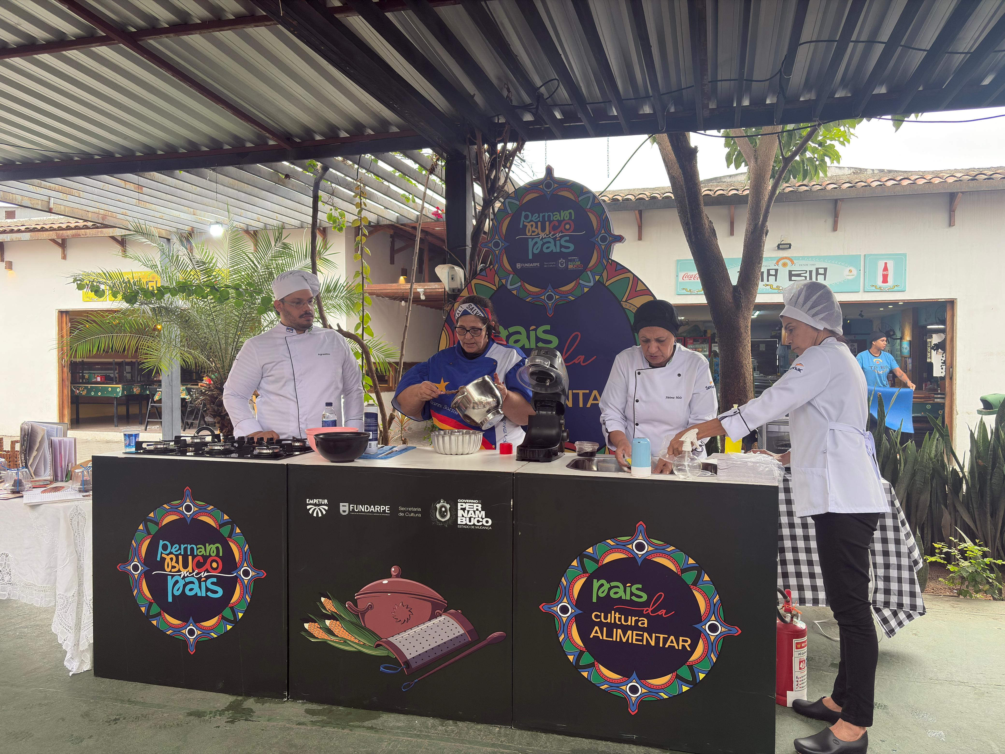 A preservação da memória familiar através dos cadernos de receitas foi o foco na ação do País da Cultura Alimentar da tarde desta sexta-feira no Festival Pernambuco Meu País em Caruaru. A atividade aconteceu na Feira de Caruaru, importante polo gastronômico e cultural da cidade, unindo tradição e salvaguarda. Enquanto preparava um bolo de noiva, Cristianne deu uma aula sobre as origens dessa receita genuinamente pernambucana, registrada inclusive Patrimônio Imaterial do Estado desde 2023, junto às suas práticas socioculturais associadas.