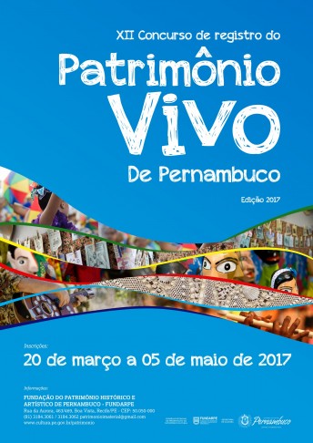 O Governo de Pernambuco, por meio da Secretaria de Cultura do Estado – Secult e da Fundação do Patrimônio Histórico e Artístico de Pernambuco – Fundarpe, lança nesta segunda-feira (20), XII Concurso Público do Registro do Patrimônio Vivo do Estado de Pernambuco – RPV-PE. O presente certame disponibilizará de seis vagas para Patrimônio Vivo do Estado de Pernambuco, referentes ao ano de 2017.