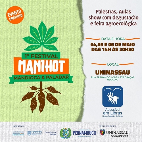 Com incentivo do Governo do Estado de Pernambuco, por meio dos recursos do Funcultura, acontece nos próximos 4, 5 e 6 de maio, das 14h às 20h, o “I Festival Manihot: Mandioca & Paladar”, na Faculdade Maurício de Nassau (Bloco C). O evento terá palestras, aulas-show (degustação) e feira agroecológica, com produtos beneficiados da mandioca.