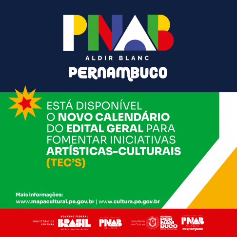 O Governo de Pernambuco, por meio da Secretaria de Cultura do Estado (Secult-PE), divulga o novo calendário do Edital Geral para Fomentar Iniciativas Artísticas-Culturais (TECs) da Política Nacional Aldir Blanc de Fomento à Cultura (PNAB Pernambuco). Devido a alta demanda, o calendário do Edital Geral para Fomentar Iniciativas Artísticas-Culturais (TECs) da Política Nacional Aldir Blanc de Fomento à Cultura (PNAB Pernambuco) passou por alterações. A publicação do resultado da etapa de Avaliação de Mérito Cultural dos editais prevista para a última terça-feira (03/12), deverá ser realizada no próximo dia 18/12.