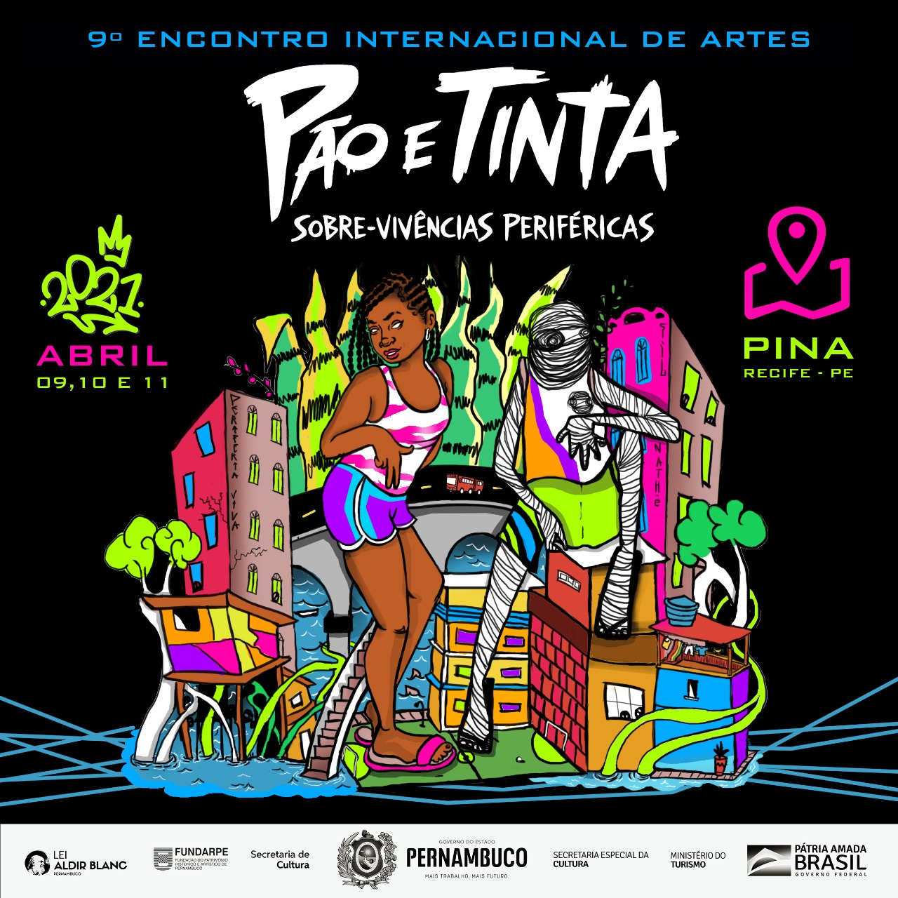 Começa nesta sexta-feira (9) o 9º Encontro Internacional de Artes Pão e Tinta que, neste ano, será transmitido pelo YouTube. O objetivo do evento é falar das Sobre-Vivências Periféricas durante a pandemia. O encontro, organizado por jovens do Coletivo Pão e Tinta da comunidade do Bode (Pina/Recife), representa a culminância de um projeto que promove estratégias de geração de renda, de fortalecimento da identidade cultural, da autoestima e do sentimento de pertencimento comunitário através da arte urbana, de oficinas de inclusão social e digital, rodas de diálogo, assim como a revitalização de espaços comerciais, educativos e outros marcados pela violência dentro do território. Essa ação de graffiti homenageou neste ano, Dona Silvonete Santos, mãe do grafiteiro Pedro Stilo e dos jovens Lucas e Mateus Santos, que foi alvejada por uma bala perdida há 19 anos. Em 2021, o beco em a moradora foi vitimada, ganhou cores e vida com os painéis de graffiti feitos pelos artistas do coletivo, passando a ser um novo espaço cultural dentro da favela.