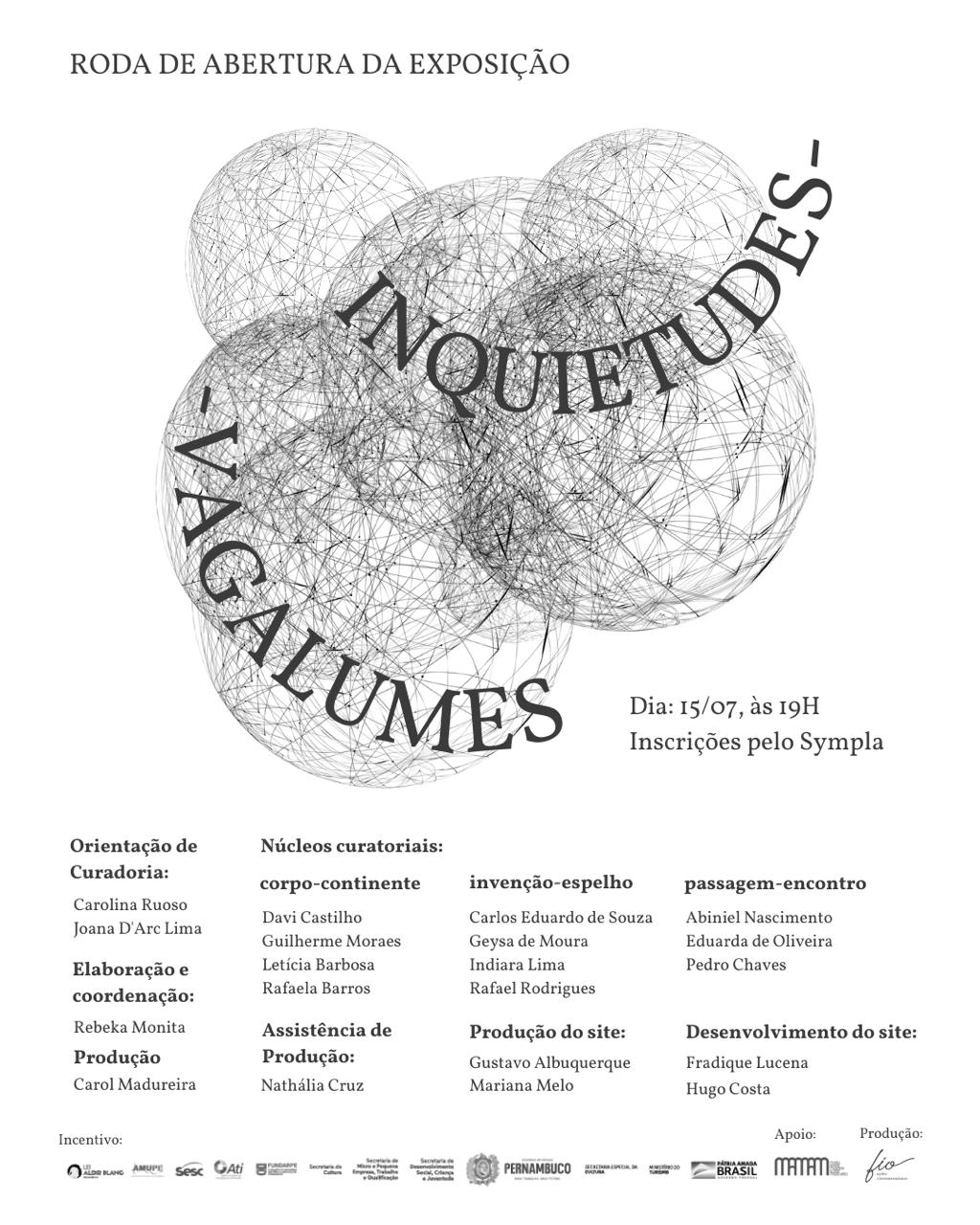 Para marcar o lançamento da exposição virtual “Inquietudes-Vagalumes”, o Museu de Arte Moderna Aloisio Magalhães (Mamam) promove uma roda de diálogo nesta quinta-feira (15), a partir das 19h, com sua equipe a fim de mostrar o processo de execução da mostra e as principais questões abordadas no decorrer da sua criação. O evento é on-line e gratuito. Para participar, é preciso realizar a inscrição através do link: www.sympla.com.br/roda-de-dialogo—lancamento-exposicao-inquietudes-vagalumes__1277367. A iniciativa conta com os recursos da Lei Aldir Blanc em Pernambuco.