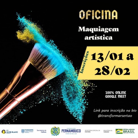 Contemplado pelos recursos da Lei Aldir Blanc em Pernambuco, o projeto “Transformar Sertão” está com inscrições abertas para OFICINA MAQUIAGEM ARTÍSTICA. Na oficina, serão abordadas noções de produção da maquiagem como uma forma de arte e cultura, técnicas, elaboração. As inscrições são gratuitas e estão disponíveis até 28/02/2022. Para se inscrever, basta preencher o formulário, disponível em docs.google.com/