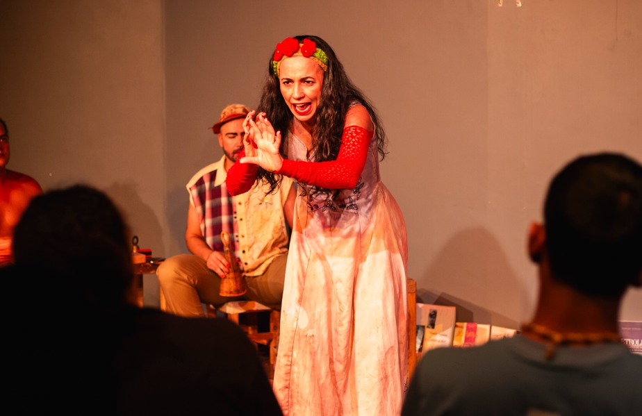 Montado pela primeira vez em 2014, ‘Palavras Andantes’ nasceu do desejo de aproximar o teatro à literatura local. O espetáculo reúne textos de escritores da região de várias épocas, de Bebela a Luis Osete, passando por Cátia Cardoso e Antônio de Santana Padilha, dentre outros – que foram incorporados ao espetáculo a partir das vivências e afetos dos próprios intérpretes. A dramaturgia é coletiva, com encenação de Thom Galiano, e reflete uma construção colaborativa e mutável: as obras ganham novos contornos a cada espaço, sem perder sua essência. Na montagem atual, compõem o elenco Raphaela de Paula, José Lírio Costa, Rafa Moraes e Zuleika Bezerra.