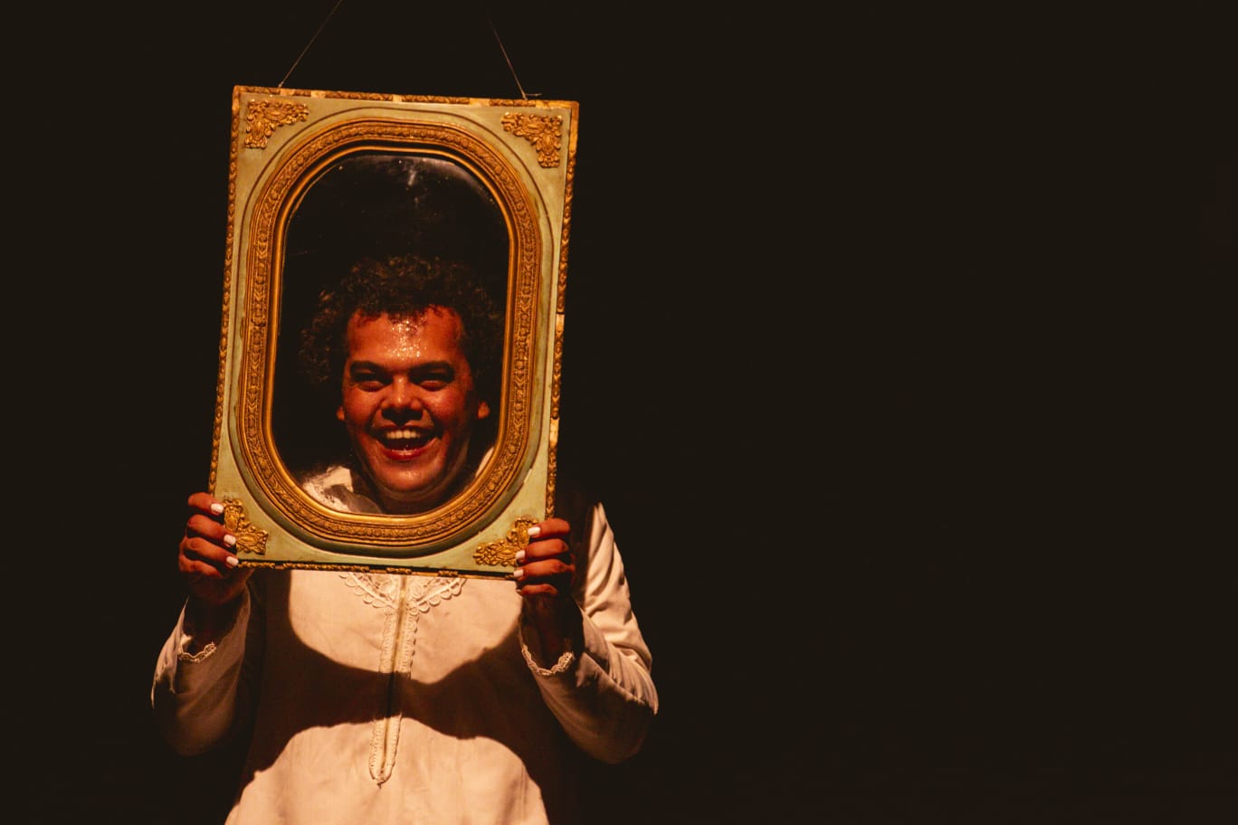 O monólogo é interpretado por Rafa Moraes e leva ao centro do palco a história de uma mulher que rompeu com os padrões estabelecidos de expressão da fé