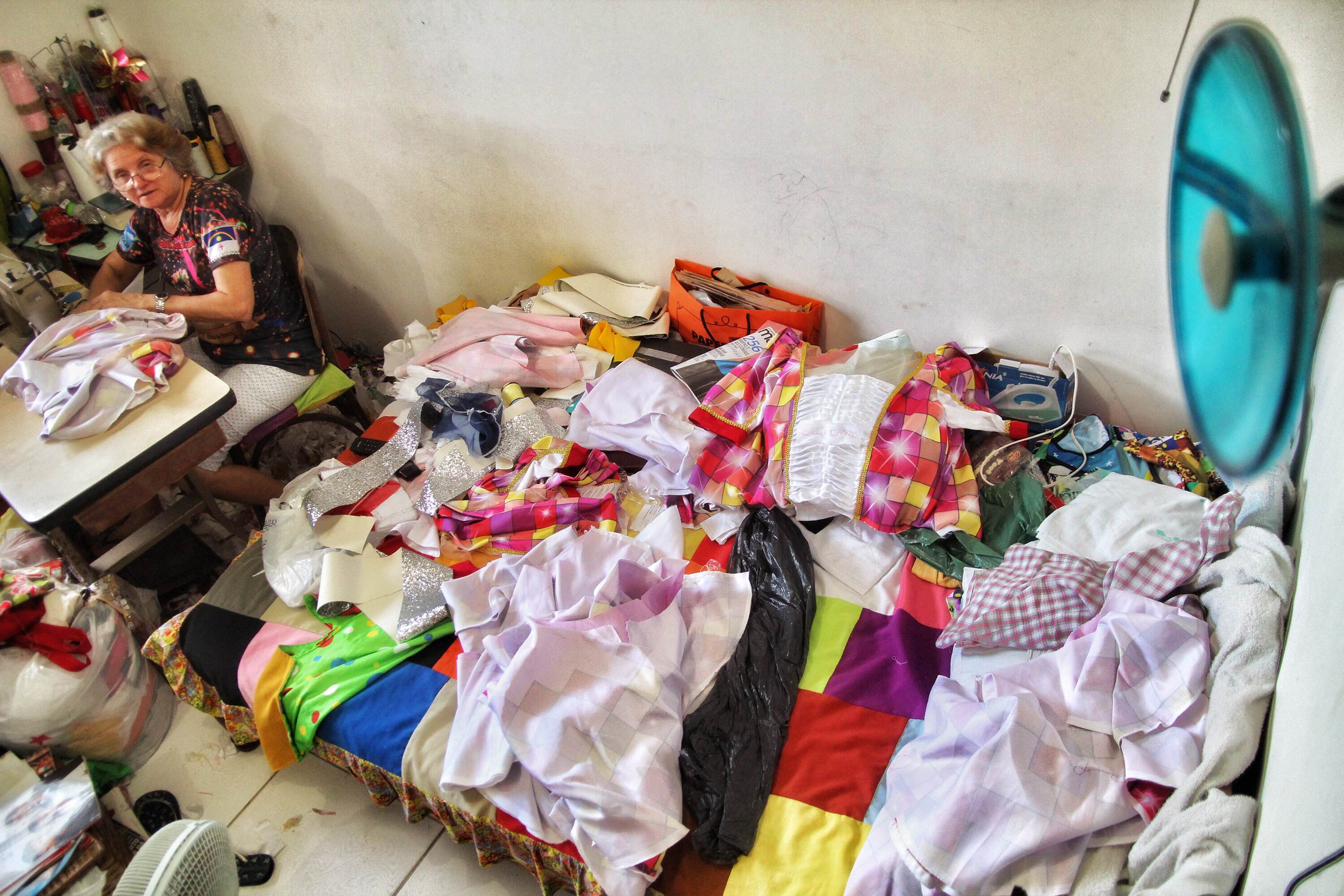 Responsável pelo figurino da ala feminina da Junina Tradição, Dona Tetei – que é também mãe do presidente do grupo, Joselito Costa – transforma sua casa em um ateliê nesta época do ano, a fim de dar conta de todo o serviço que lhe é delegado. “Desculpe a bagunça, meu filho, mas não tenho tempo nem para dormir quando vai se aproximando o dia da nossa estreia. Sento-me na máquina às 8h30 da manhã e só vou dormir às 4h do dia seguinte. É uma rotina puxada, porém, é muito gratificante ver o nosso trabalho sendo exposto em vários cantos do Estado”, disse, cuidando dos últimos ajustes dos vestidos. Além dela, a JT conta com uma equipe de sete costureiras fixas, fora a colaboração das auxiliares e dos próprios quadrilheiros, que, vez por outra, ajudam no bordado das pedrarias. “Temos 112 integrantes – 56 damas e 56 cavaleiros. Por conta dos atos propostos no tema João: São João, Santo de Fé, Homem de Festa, pelo nosso projetista Anderson, tivemos que confeccionar neste ano 224 looks (um para cada ato). É trabalhoso, mas conseguimos cumprir com nossa missão”, disse Maria Lúcia, a Dona Nena, que capitaneia a confecção da ala masculina.
