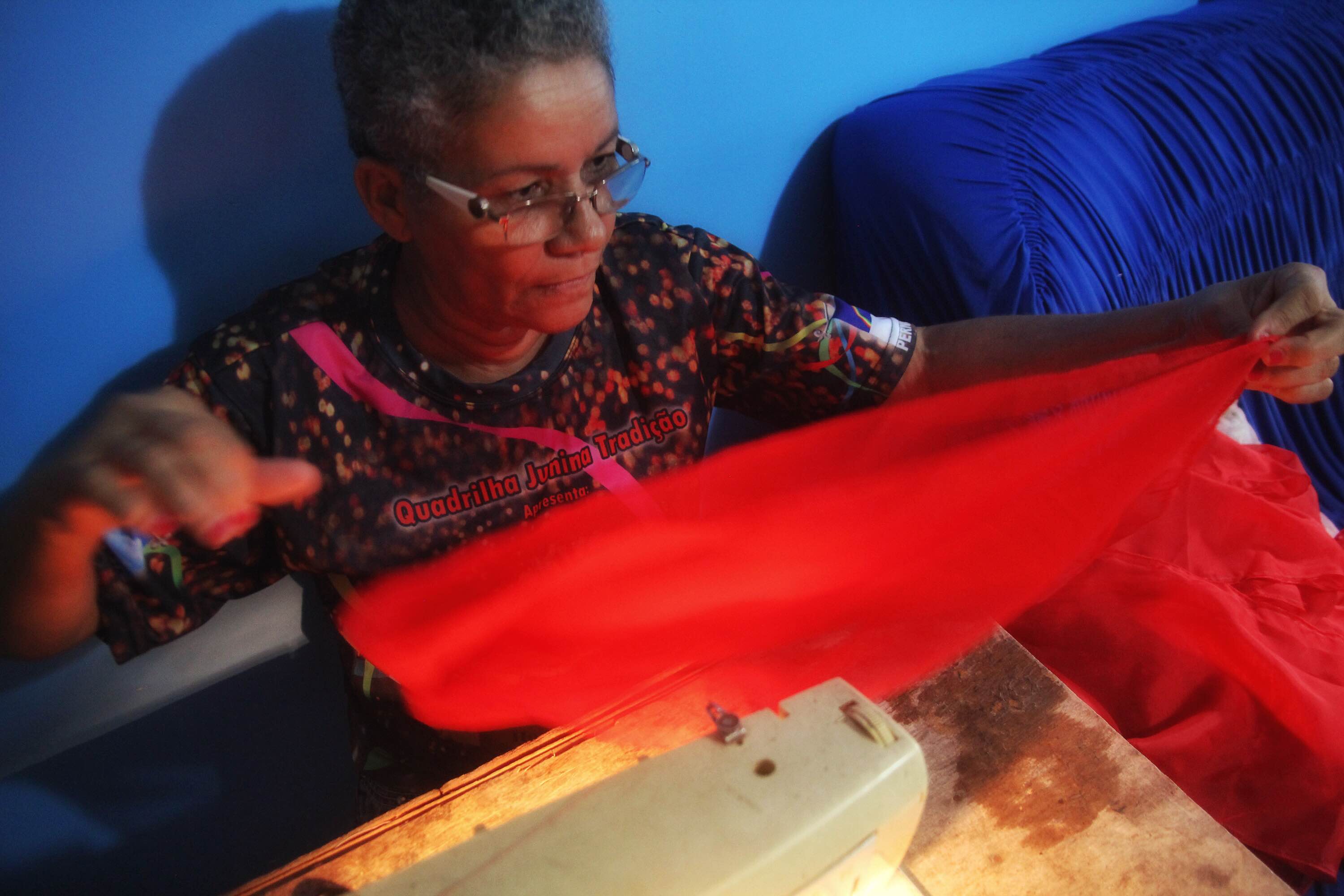 Assim como na casa de D. Tetei, a residência de D. Nena fica tomada de tecidos, aviamentos e adereços nesse período que antecede o ciclo junino. “Ao contrário das agremiações carnavalescas, não reaproveitamos os nossos figurinos – costumamos vendê-los para quadrilhas de outros estados. Então, todos os anos começamos do zero: o estilista manda os croquis entre o final de março/início de abril, criamos o piloto e, quando aprovado, corremos contra o tempo para entregar tudo”, diz ela que já terminou o figurino dos cavaleiros e, para agilizar a entrega das roupas, está ajudando a finalizar os looks das damas, com o apoio da sua fiel escudeira Nidete Cristina. Juntas, as duas costuram há 11 anos para Junina Tradição, e, entre um botão e outro, ainda encontram fôlego para enfrentar a maratona de apresentações do grupo pelos arraiais de Pernambuco. “Assistimos a todas [as apresentações], que já começam sábado (13), com o festival da Globo, no Sesc Goiana. Somos da retaguarda. E sempre levamos linha e agulha na bolsa para qualquer eventualidade”, contou Nidete.