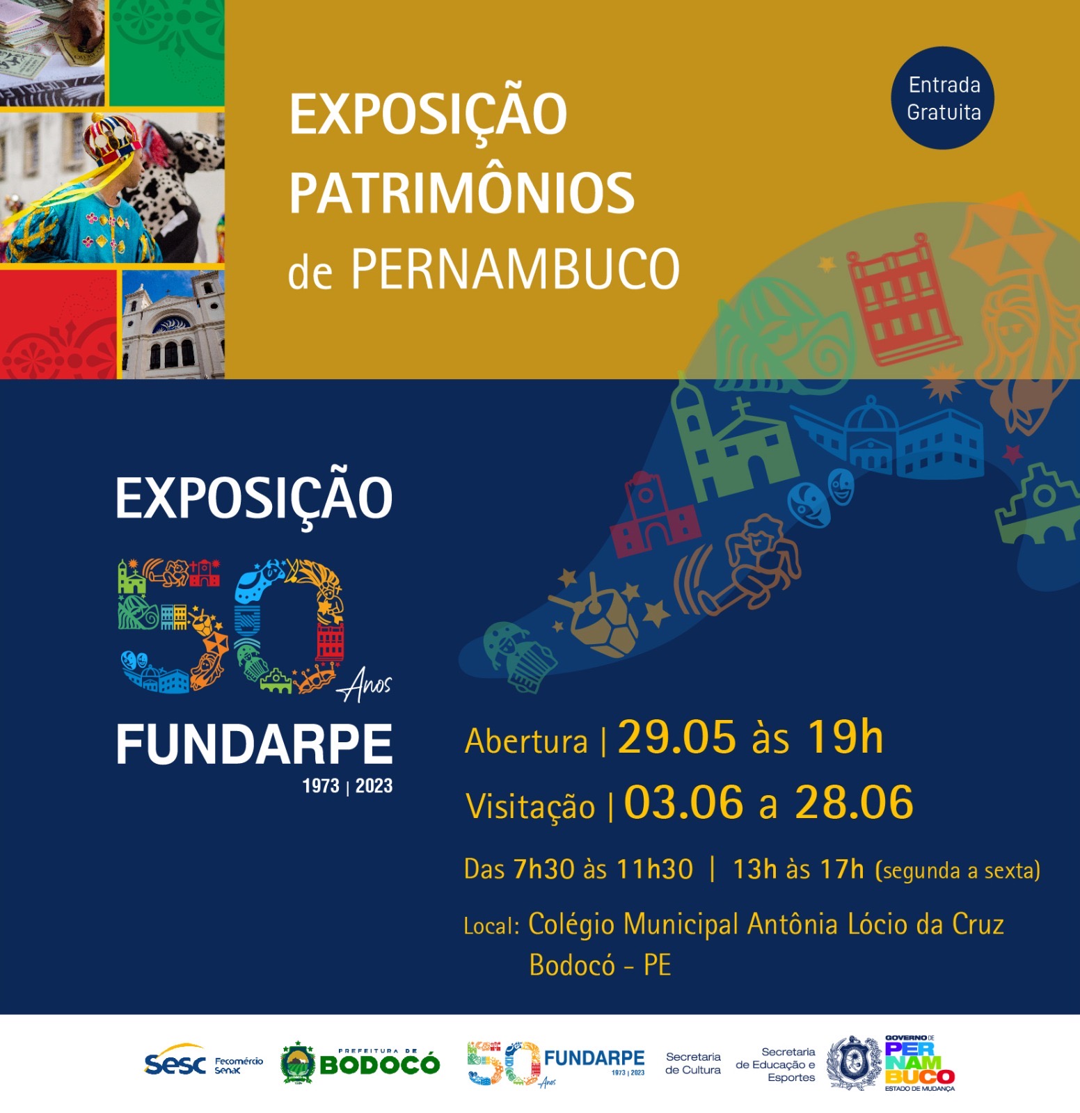 Nesta quarta-feira (29), a cidade de Bodocó, no Sertão do Araripe, recebe as exposições “Patrimônios de Pernambuco” e “Fundarpe 50 Anos”. Elas aportarão no Colégio Municipal Antônia Lócio da Cruz. A abertura está marcada para às 19h e a visitação começará na próxima segunda-feira (3), seguindo até o dia 28 de junho, sempre de segunda a sexta, das 7h30 às 11h30 e de 13h às 17h.