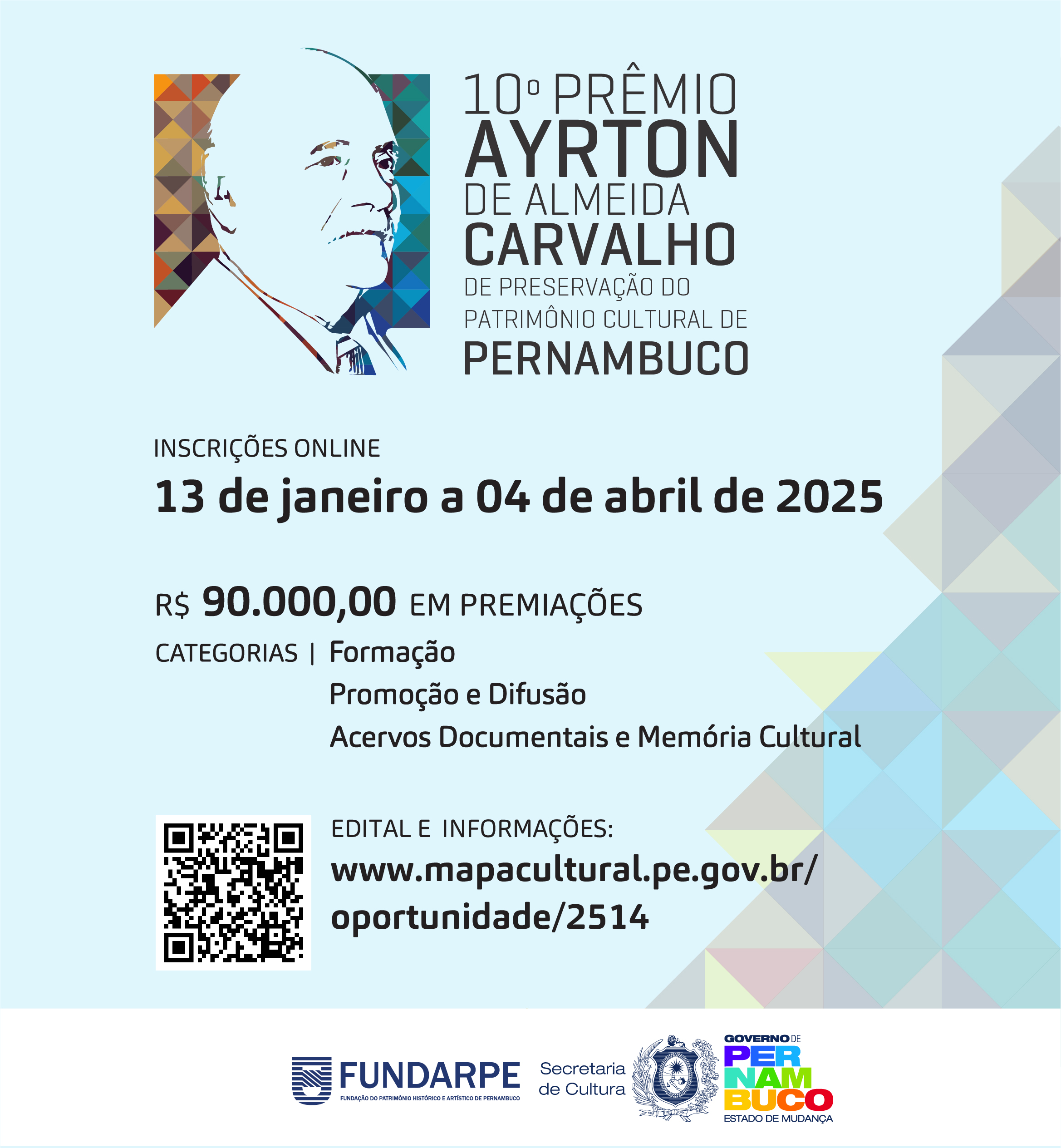 O Governo do Estado de Pernambuco, por meio da Secretaria Estadual de Cultura (Secult-PE) e da Fundação do Patrimônio Histórico e Artístico (Fundarpe), anunciou nesta sexta-feira (27) o lançamento do edital do 10º Prêmio Ayrton de Almeida Carvalho de Preservação do Patrimônio Cultural de Pernambuco (PAAC). As inscrições estarão abertas gratuitamente na plataforma Mapa Cultural de Pernambuco no período de 13 de janeiro até as 16h59 do dia 4 de abril de 2025.