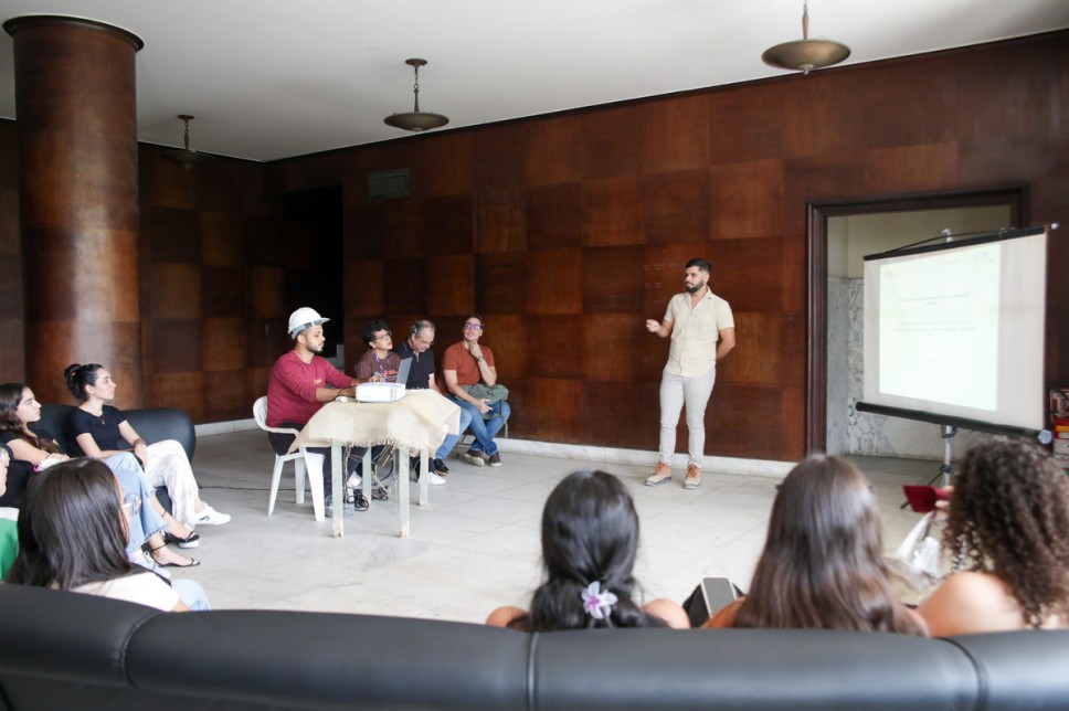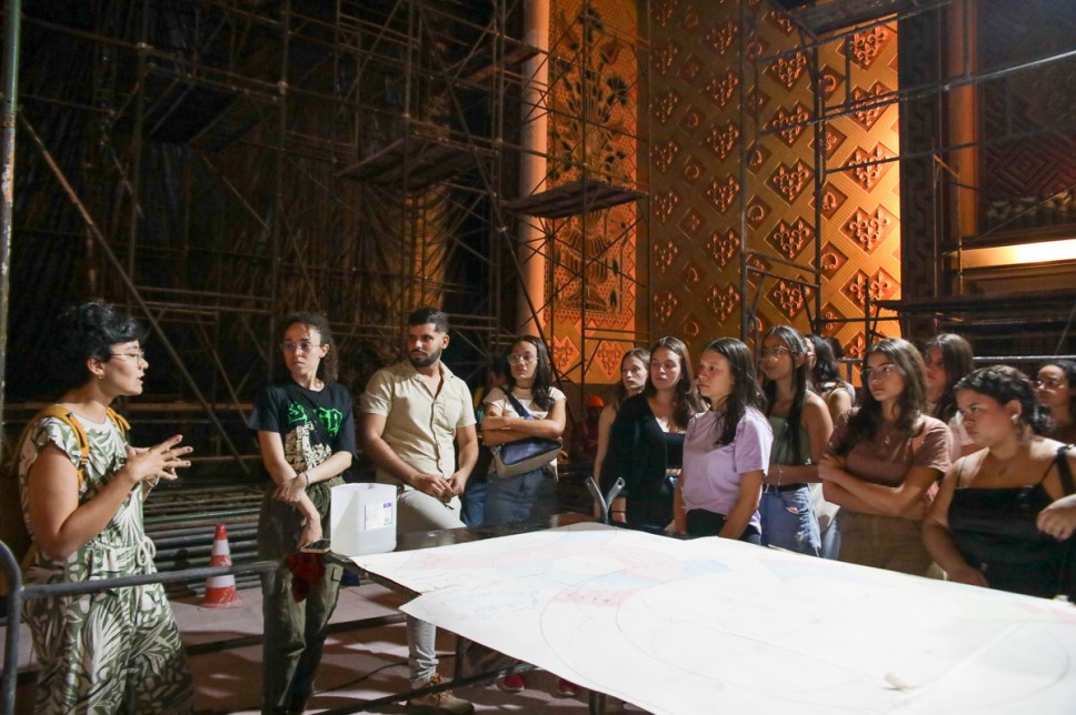 Antes de conhecerem presencialmente o canteiro de restauro do São Luiz, os estudantes assistiram, no mezanino, a uma apresentação em que Matheus explicou em detalhes cada etapa do processo da obra. Em seguida foram para a sala do cinema, no térreo, onde puderam conferir boa parte do forro decorado já restaurado e demonstrações de como o gesso é montado.