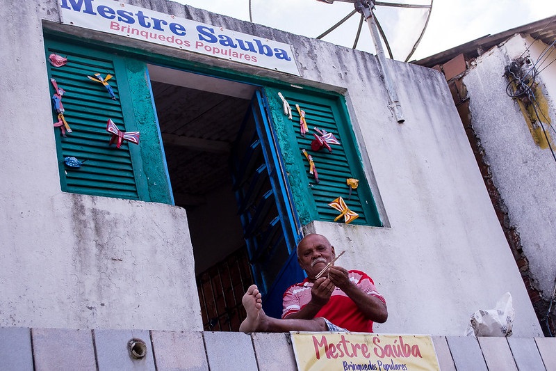 O trabalho debaixo do sol causticante do Agreste, rendeu ao menino uma pele que não bronzeava, mas ficava rosa, vermelha como uma formiga saúva, ou saúba, como chamava o povo. Daí veio o apelido. Com muito trabalho e pouco tempo, e nenhum dinheiro para divertimentos, o menino Saúba aprendeu a fazer carrinhos de madeira com pedaços de pau encontrados na usina. “Era o que tinham para brincar”. Dali a pouco, estava fazendo por encomenda, para outros garotos da região. “Dia de domingo, a gente brincava de fazer esses brinquedos. Ninguém ensinou. Eu fazia carrinho, rolimã, fazia usina, burrica”, conta. Burrica é uma espécie de “roda-roda”, um pequeno carrossel. Saúba nunca imaginou que levaria aquela diversão como um ofício na vida, mas aos poucos foi se transformando num sonho de aprender cada vez mais, de ser um mestre daquela profissão.