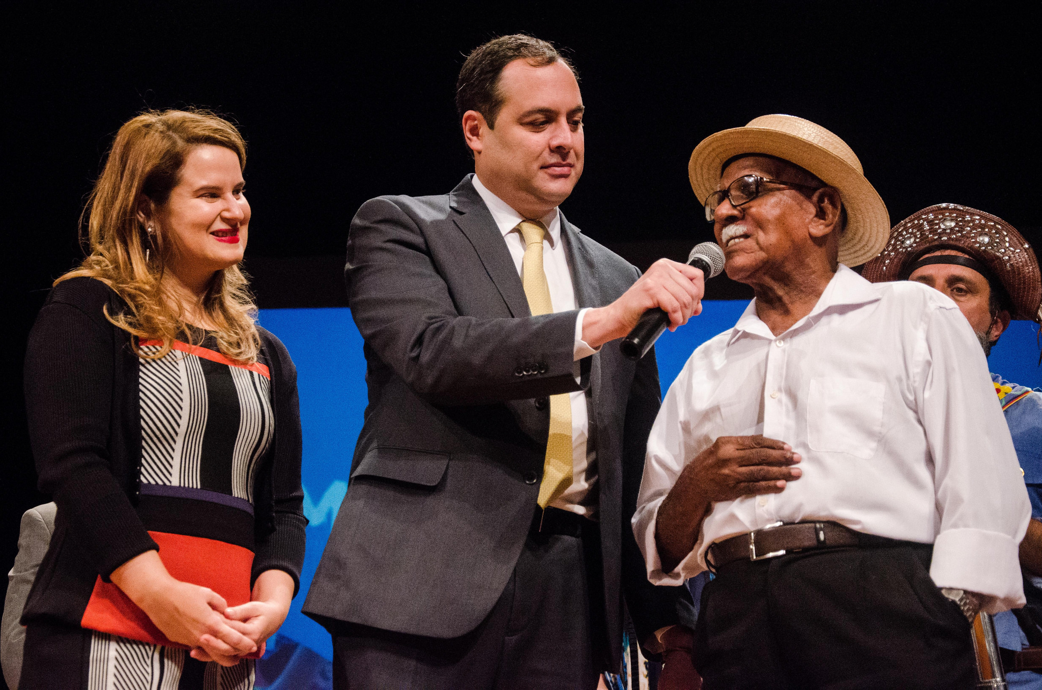 “Nós estamos vindo da comunidade quilombola de Inhanhum, que quer dizer ‘água que corre’. Eu queria agradecer por esse título e dizer que estou há pouco tempo no grupo, tenho 39 anos, enquanto ele celebra há mais de 200. Hoje a maioria dos integrantes é composta por mulheres e isso também deve ser comemorado”, contou Ana Lúcia, presidente do Reisado Inhanhum (reisado/Santa Maria da Boa Vista). Finalizando as falas dos Patrimônios Vivos, o ator José Pimentel José Pimentel (artes cênicas/Recife) agradeceu aos que participaram dessa história. “Eu quero a partir desse título seguir com meu trabalho com o teatro e nas artes em geral, com honestidade, ética e vontade de levar a todos o que eu aprendi e o que eu tenho pra aprender”.
