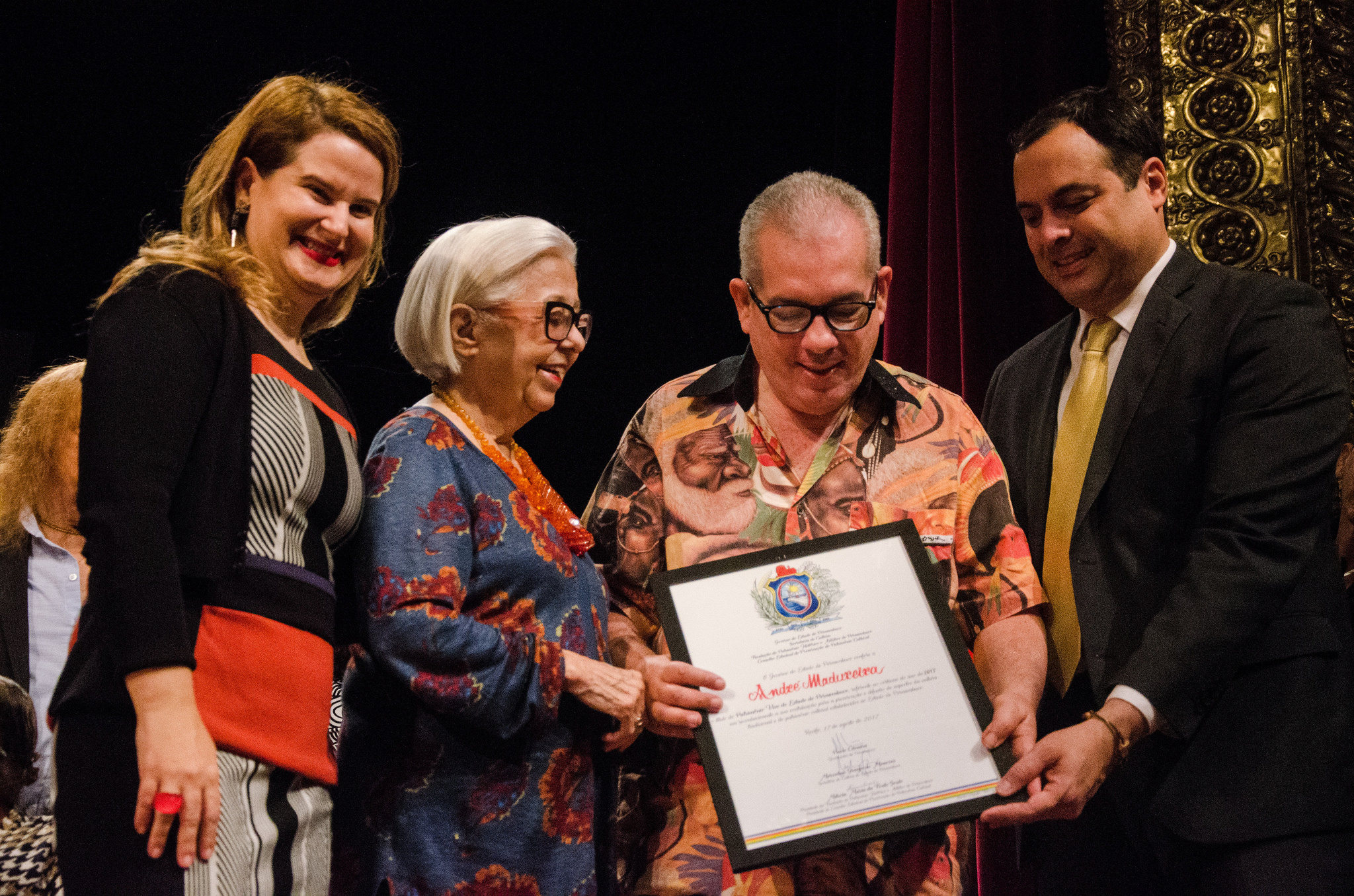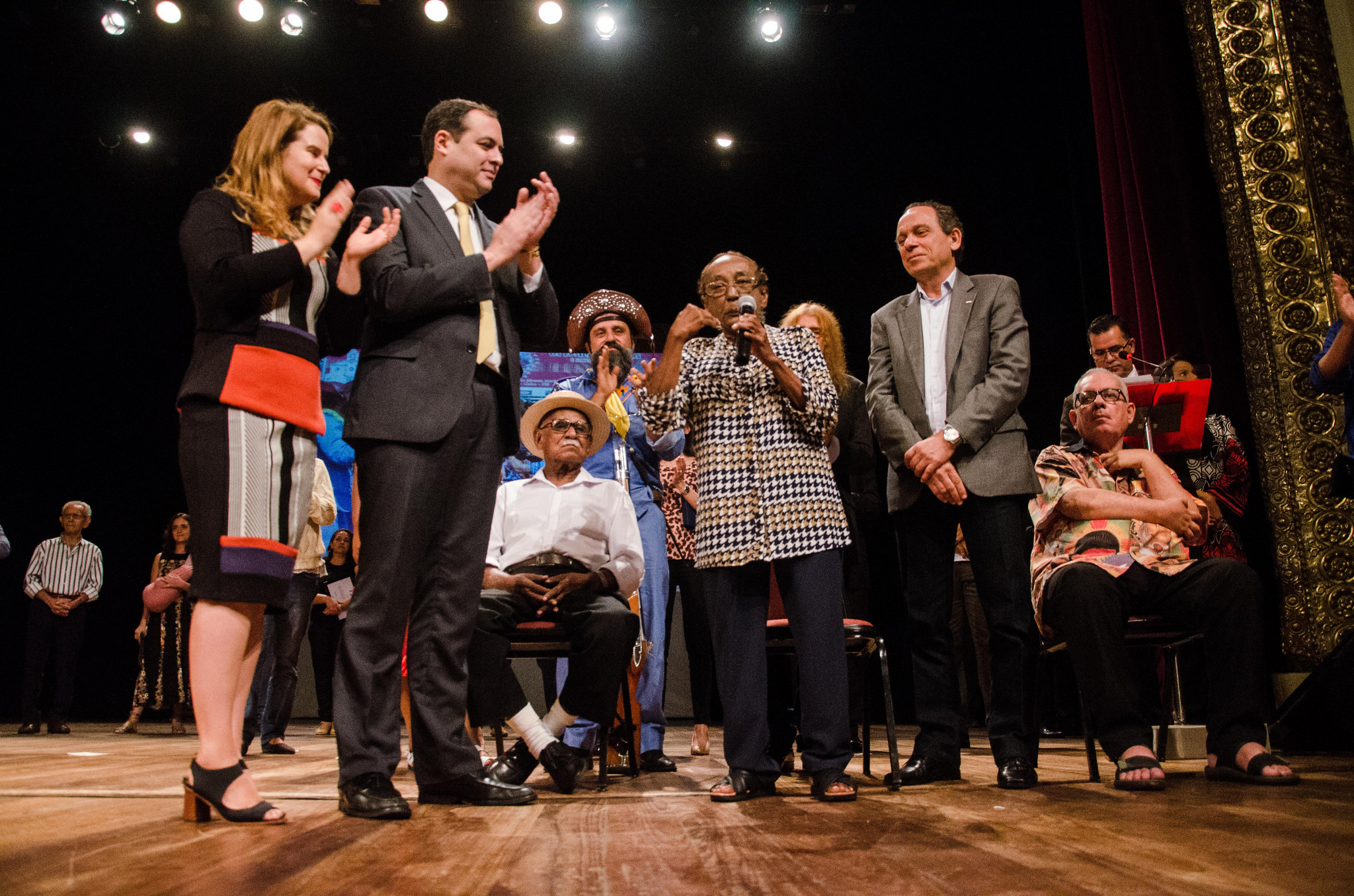 Os novos seis Patrimônios Vivos de Pernambuco foram diplomados na manhã desta quinta-feira (17), durante ato no Teatro de Santa Isabel que contou com a presença do governador Paulo Câmara, autoridades políticas e personalidades da cultura pernambucana. O ato, marcado para acontecer no Dia Nacional do Patrimônio Histórico, titulou os nomes de Maria dos Prazeres, Mestre Chocho, André Madureira, José Pimentel, Reisado Inhanhum e Sociedade dos Bacamarteiros do Cabo como novos patrimônios, que foram diplomados junto aos vencedores do 2º Prêmio Ayrton de Almeida Carvalho de Preservação do Patrimônio Cultural.
