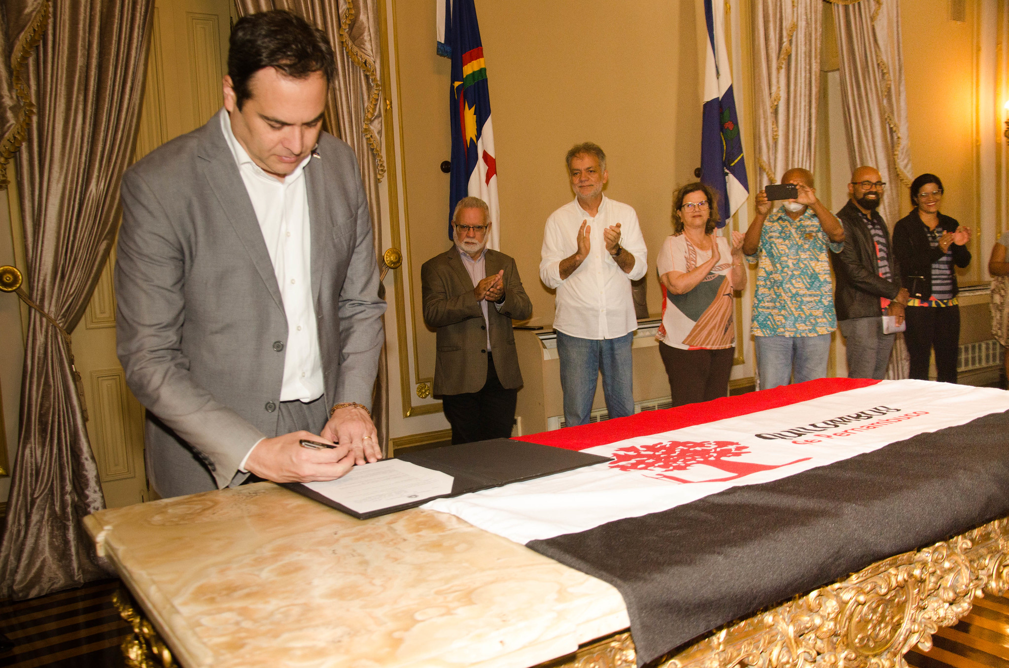 Em seguida, as lideranças quilombolas seguiram para a solenidade de sanção do governador Paulo Câmara, no Palácio do Campo das Princesas, da Lei de Admissão de Professores Quilombolas e anúncio de outras ações do Governo de Pernambuco. Com a lei, estes profissionais poderão ser contratados por meio de análise curricular, a partir da notória capacidade técnica, tendo como requisito que esses professores integrem o público a ser atendido.