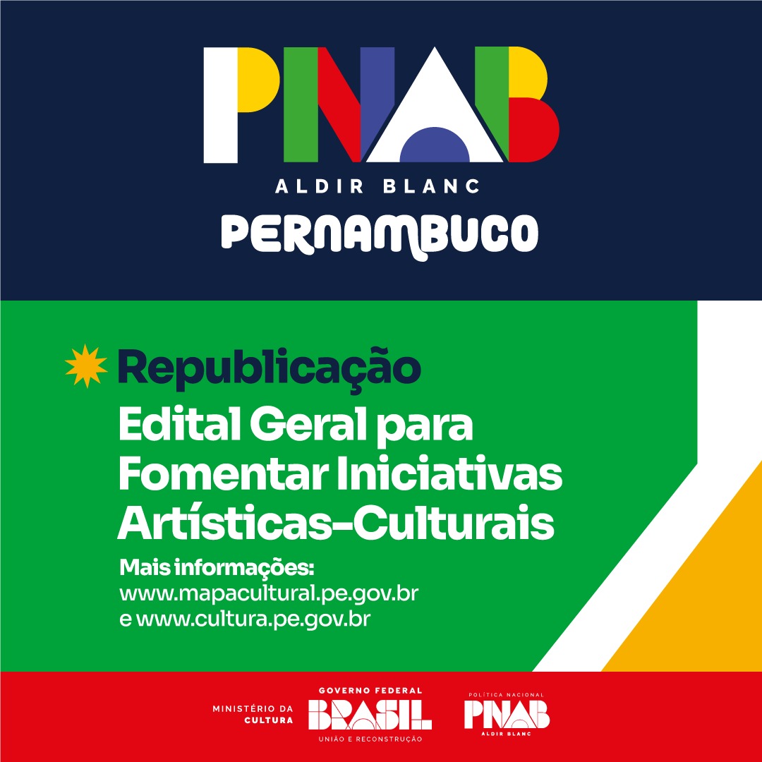 As submissões aos editais da PNAB Pernambuco deverão ser feitas, exclusivamente, na plataforma do Mapa Cultural de Pernambuco, através do link www.mapacultural.pe.gov.br/oportunidades. As inscrições dos outros seis editais ( Premiação ; Bolsa ; Fomento de Iniciativas Artísticas-Culturais, Premiação de Mulheres Negras; Premiação dos Povos e Comunidades Tradicionais; Cultura Viva Ponto de Cultura e Cultura Viva Pontões de Cultura, da PNAB Pernambuco, finalizam amanhã (sexta-feira, 11 de outubro). Os editais estão disponíveis para consulta, além do Mapa Cultural, no Portal Cultura.PE (www.cultura.pe.gov.br/).