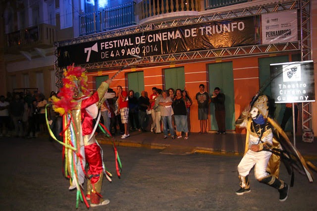 Os estampidos dos chicotes dos Caretas anunciavam: começava, então, a 7ª edição do Festival de Cinema de Triunfo. As figuras típicas do município realizavam performances em frente ao Cine Theatro Guarany, chamando a atenção do público que se aglomerava no local, aguardando a abertura das portões para a primeira sessão do evento, que aconteceu na noite desta segunda (4), reunindo público e realizadores num mesmo espaço para prestigiar a produção cinematográfica pernambucana e nacional.