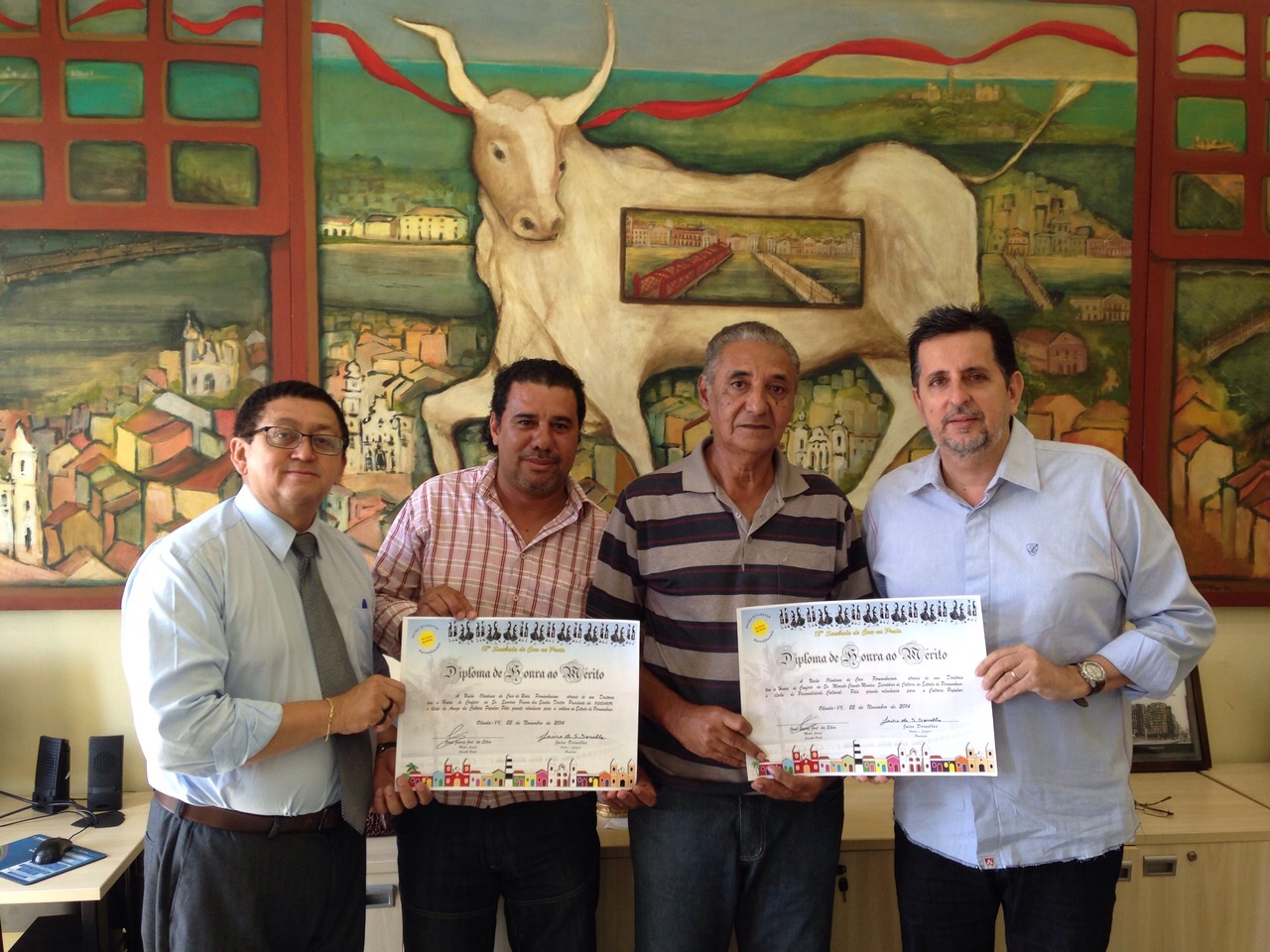 Representantes da União Olindense de Coco Pernambucano entregaram na manhã desta quinta-feira, 11 de dezembro, títulos de Personalidade Cultural ao secretário estadual de Cultura, Marcelo Canuto e a Severino Pessoa, presidente da Fundarpe.