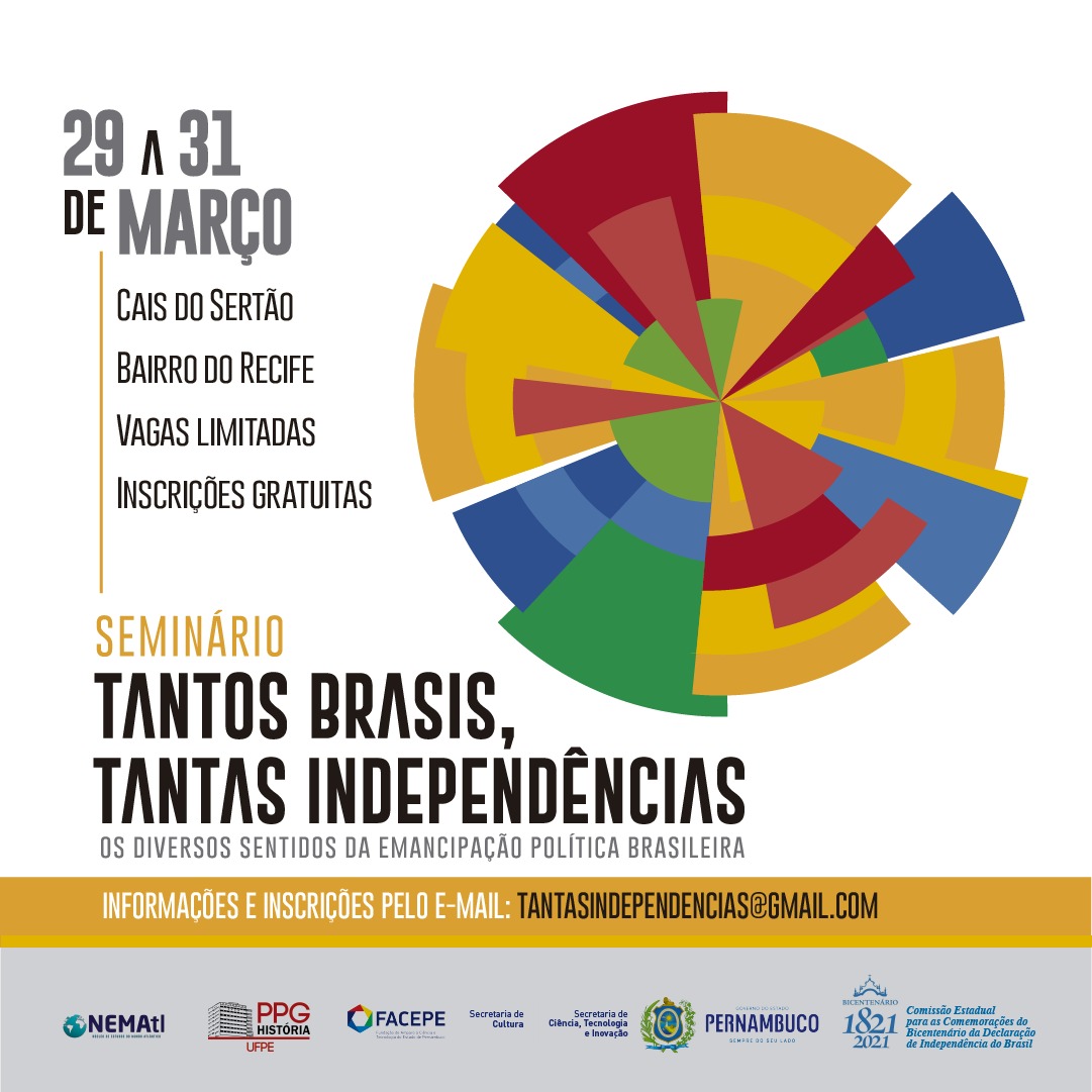 A Secretaria Estadual de Cultura (Secult-PE), por meio da Comissão Estadual para as Comemorações do Bicentenário da Declaração de Independência do Brasil, promove, entre os dias 29 e 31 de março, o Seminário Internacional “Tantos Brasis, Tantas Independências: Os Diversos Sentidos da Emancipação Política Brasileira”. As atividades serão realizadas presencialmente no Museu Cais do Sertão (Bairro do Recife) e terão transmissão ao vivo pelo Youtube da Secult-PE/Fundarpe (www.youtube.com/secultpe). As inscrições são gratuitas e as vagas são limitadas. Para se inscrever, as pessoas interessadas devem entrar em contato por meio do e-mail tantasindependencias@gmail.com.
