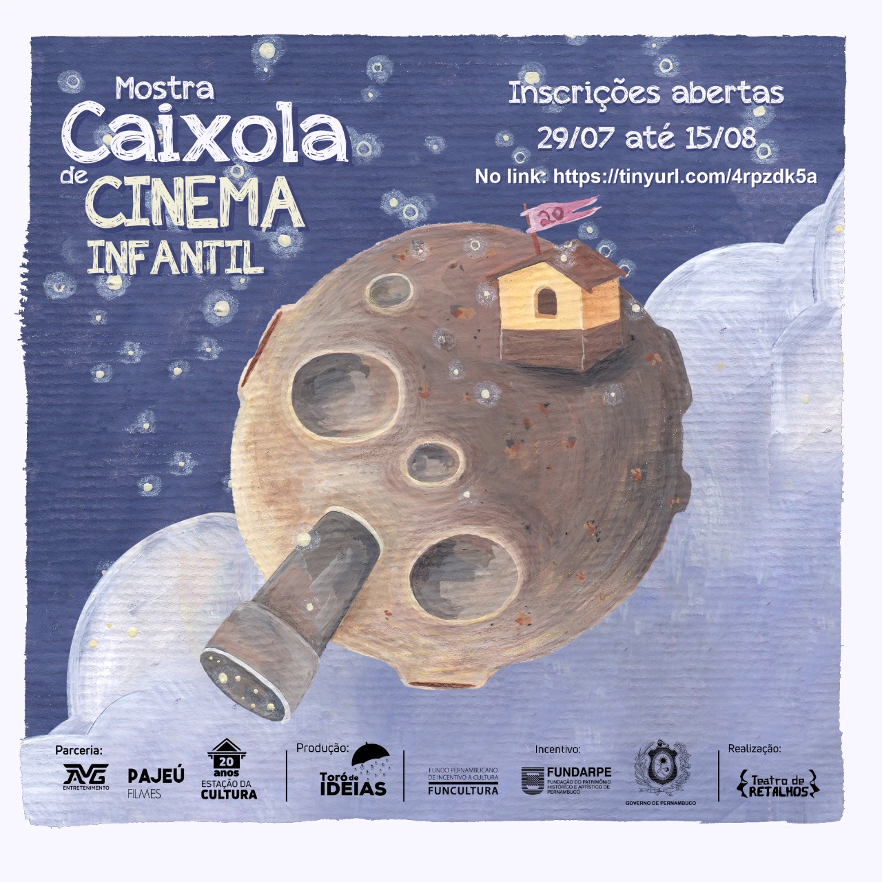 A Mostra Caixola de Cinema Infantil conta com incentivo do Funcultura e é uma realização do Teatro de Retalhos, com produção do Toró de Ideias e parceria da Pajeú Filmes e da Estação da Cultura. Para mais informações: Instagram @mostracaixola | E-mail caixolamostra@gmail.com.